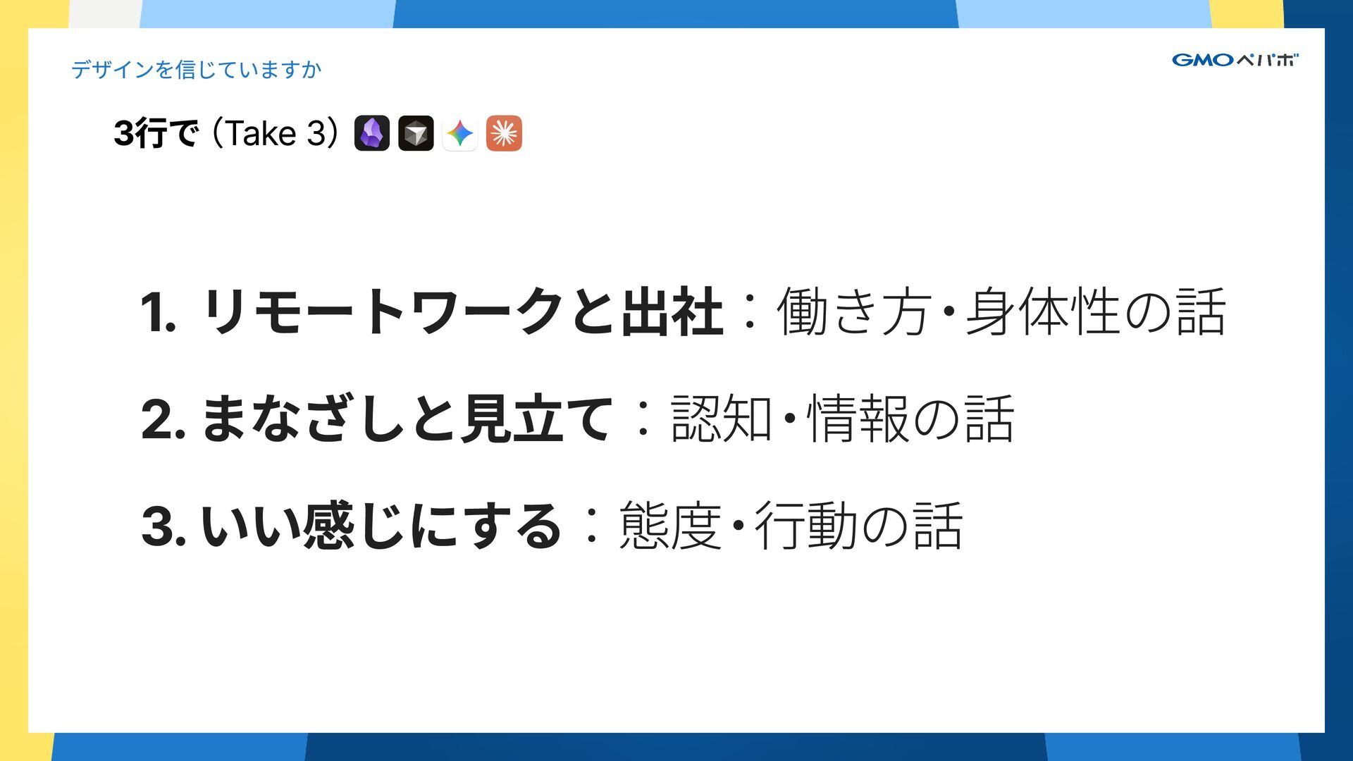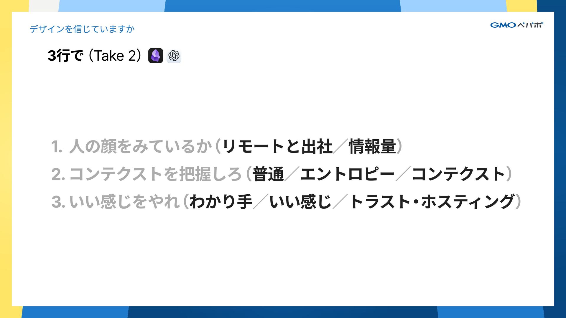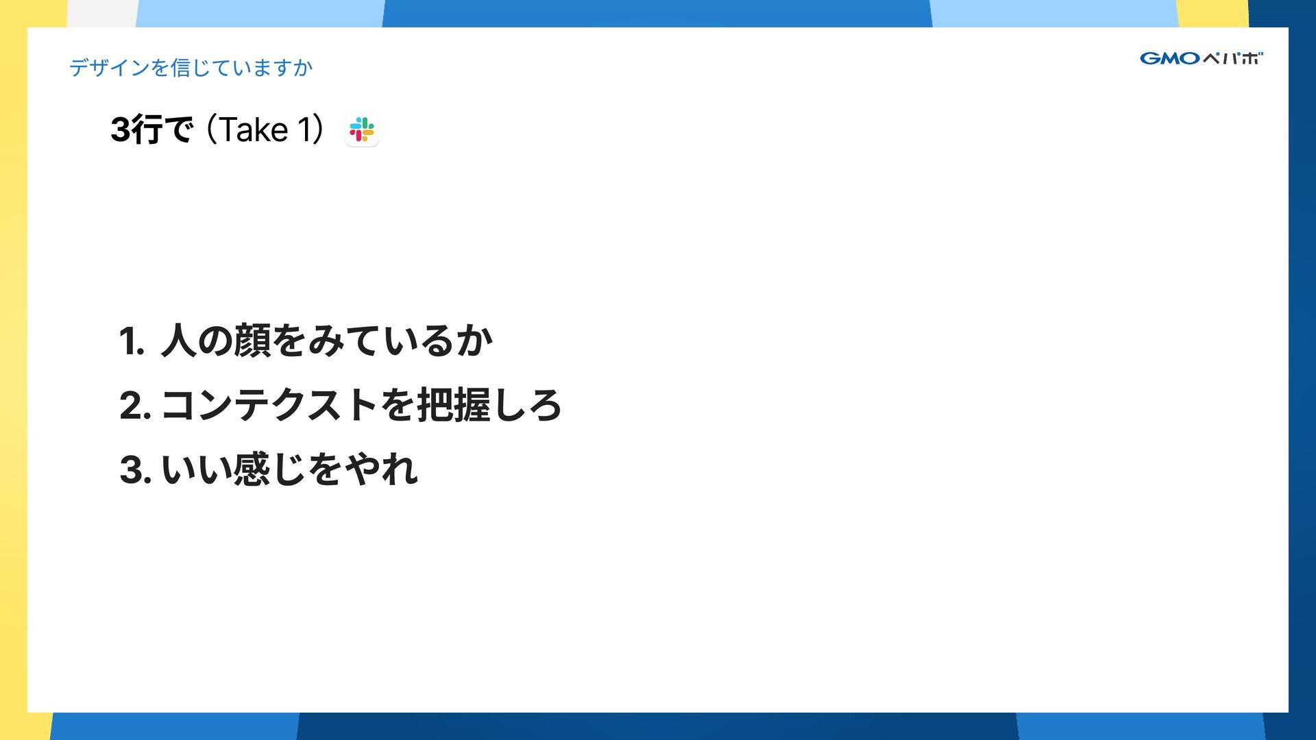 2. 3行で(Take 2) デザインを信じていますか 1. 人の顔をみているか ( / ) 2. コンテクストを把握しろ