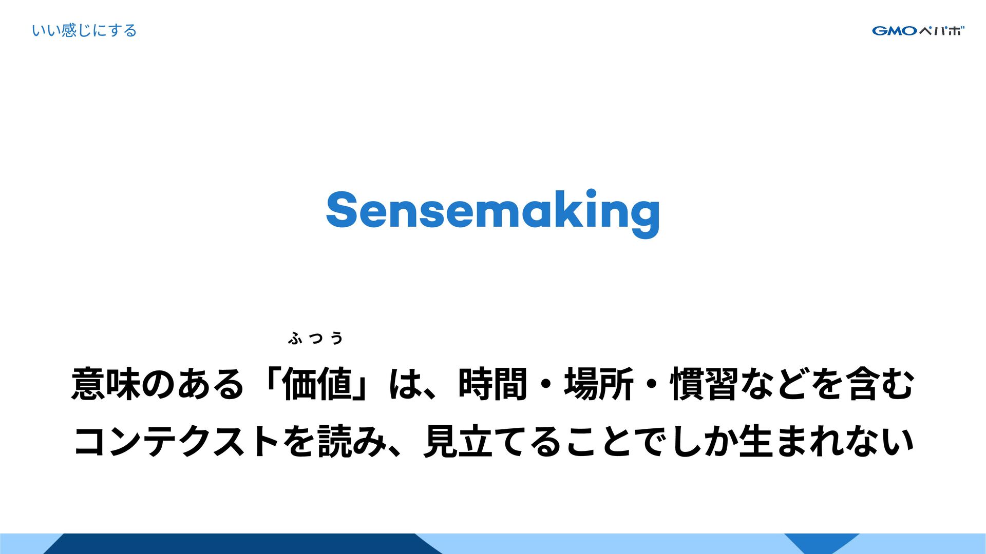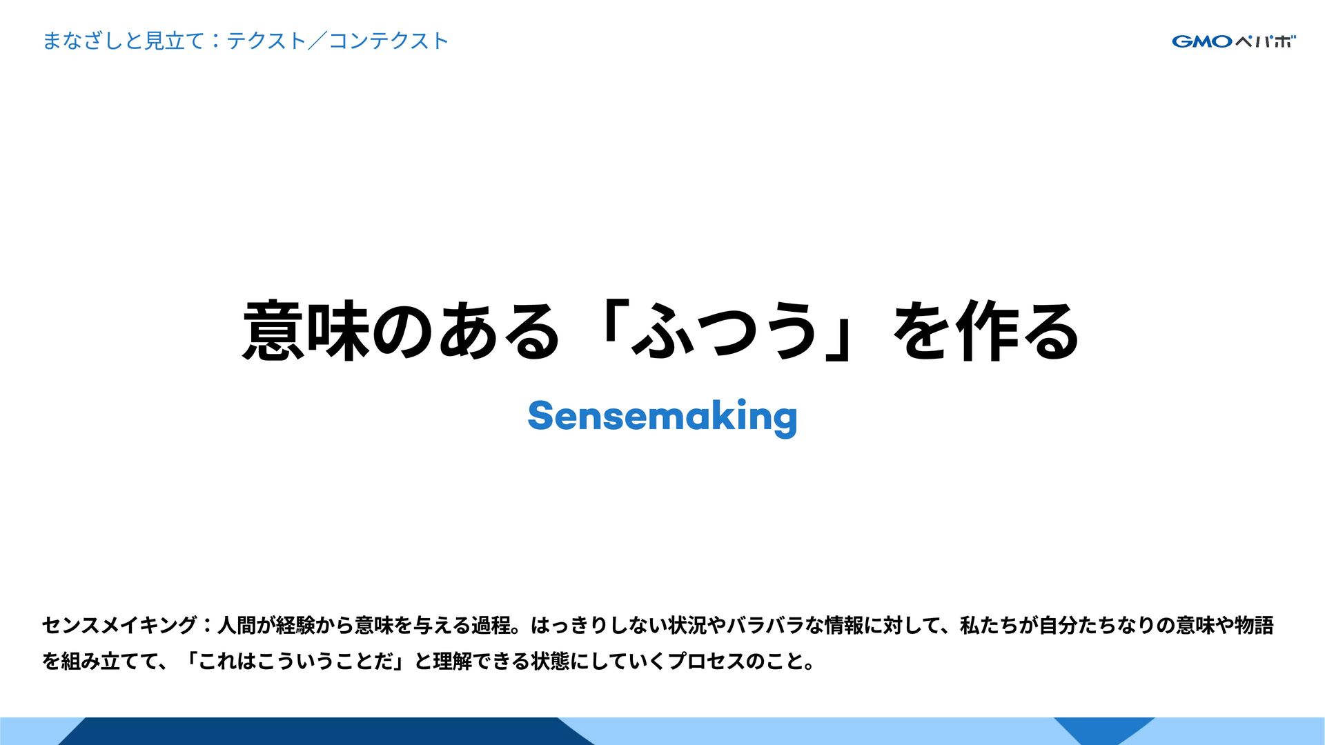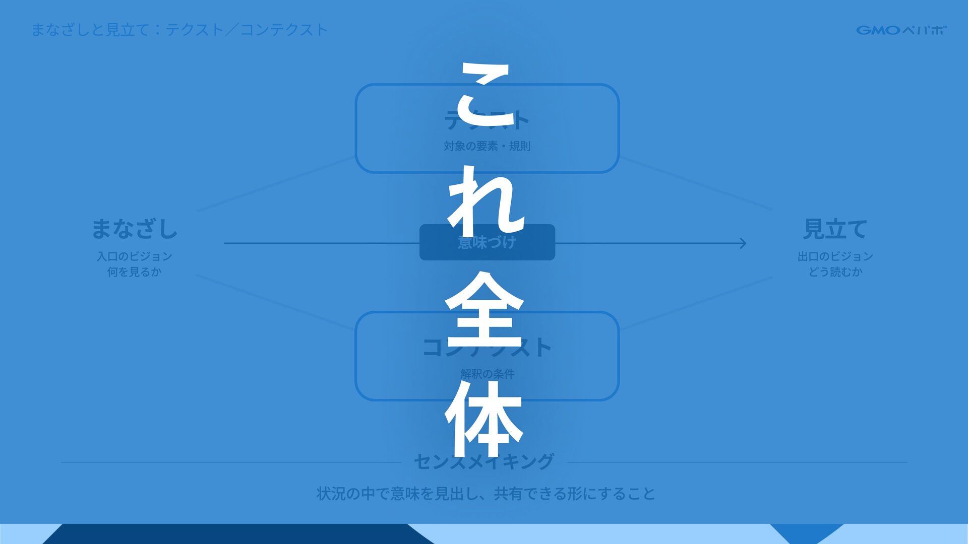 コンテクスト 解釈の条件 センスメイキング 状況の中で意味を見出し、共有できる形にすること こ れ 全 体