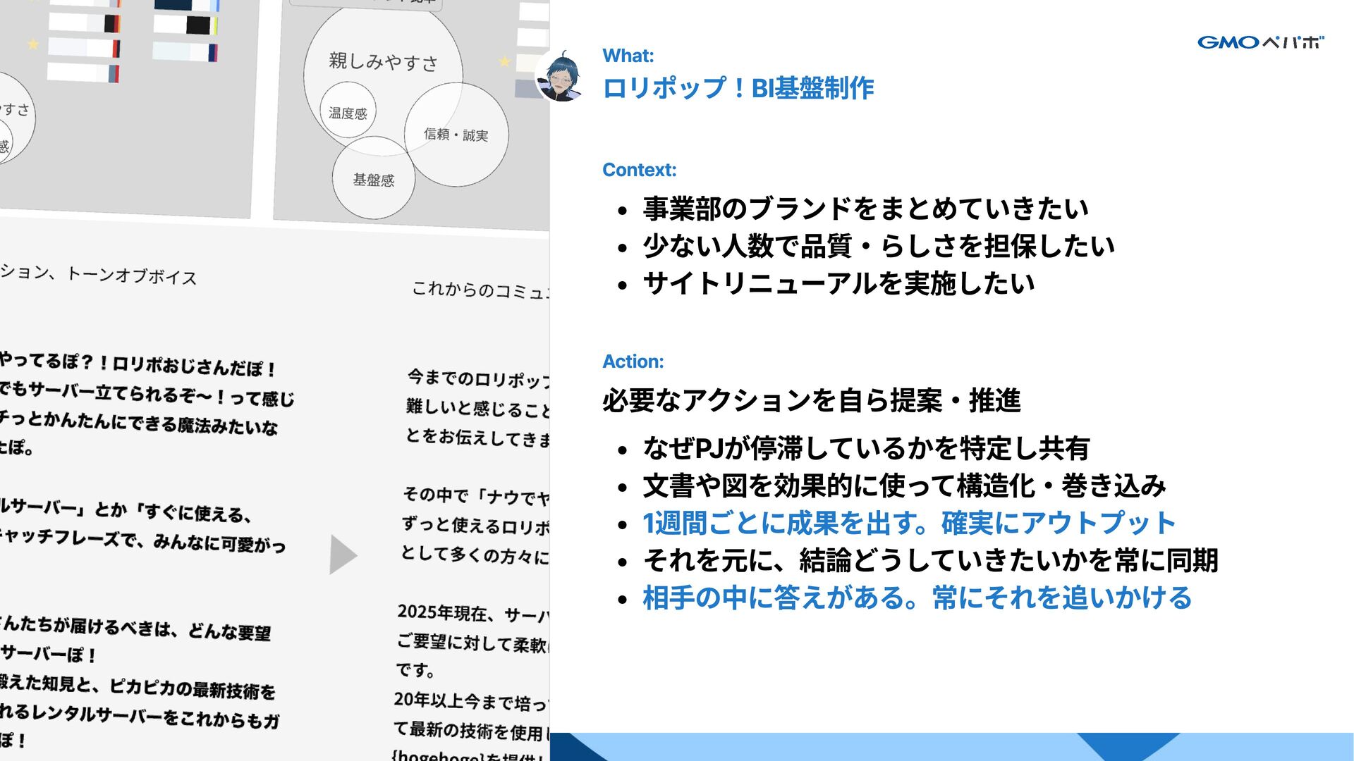 4. わかり手の例 What: ロリポップ!BI基盤制作 Context: Action: 事業部のブランドをまとめていきたい 少ない人数で品質・らしさを担保したい サイトリニューアルを実施したい 必要なアクションを自ら提案・推進 なぜPJが停滞しているかを特定し共有