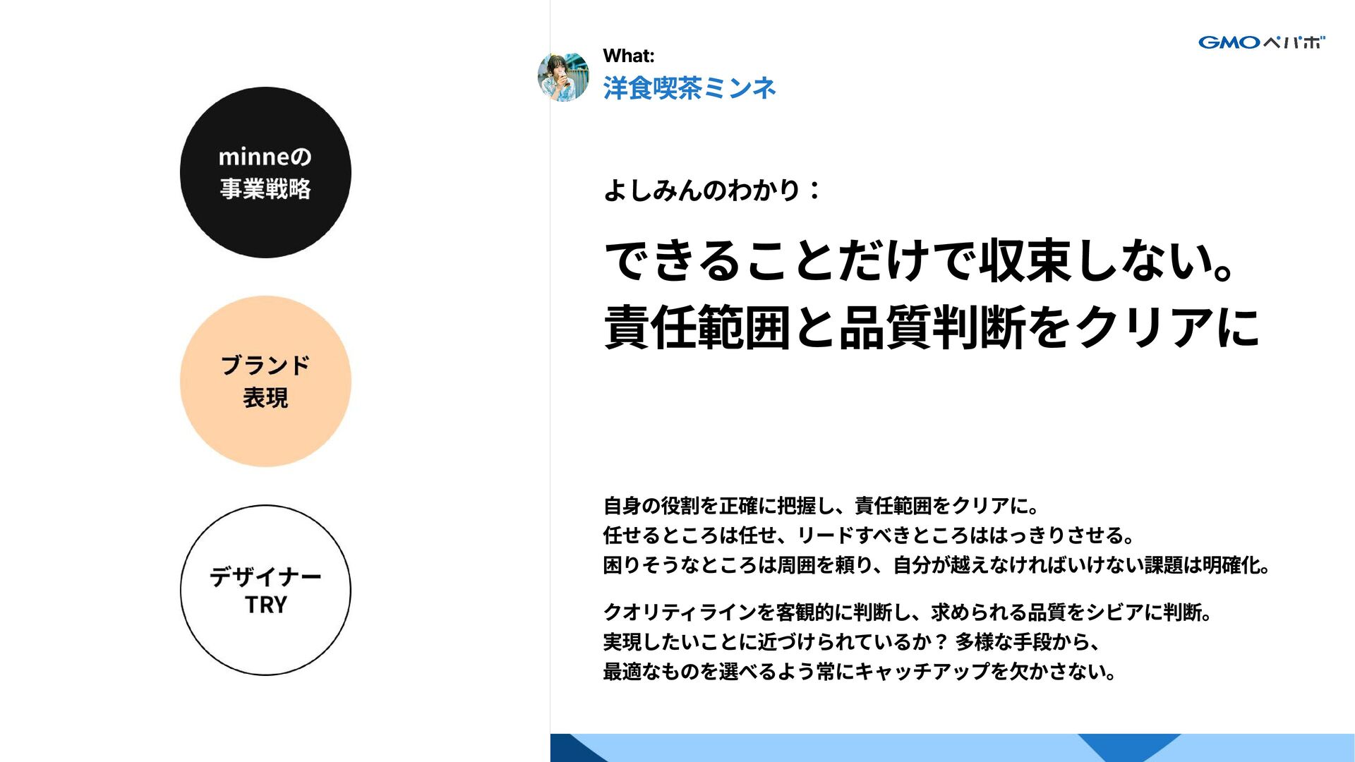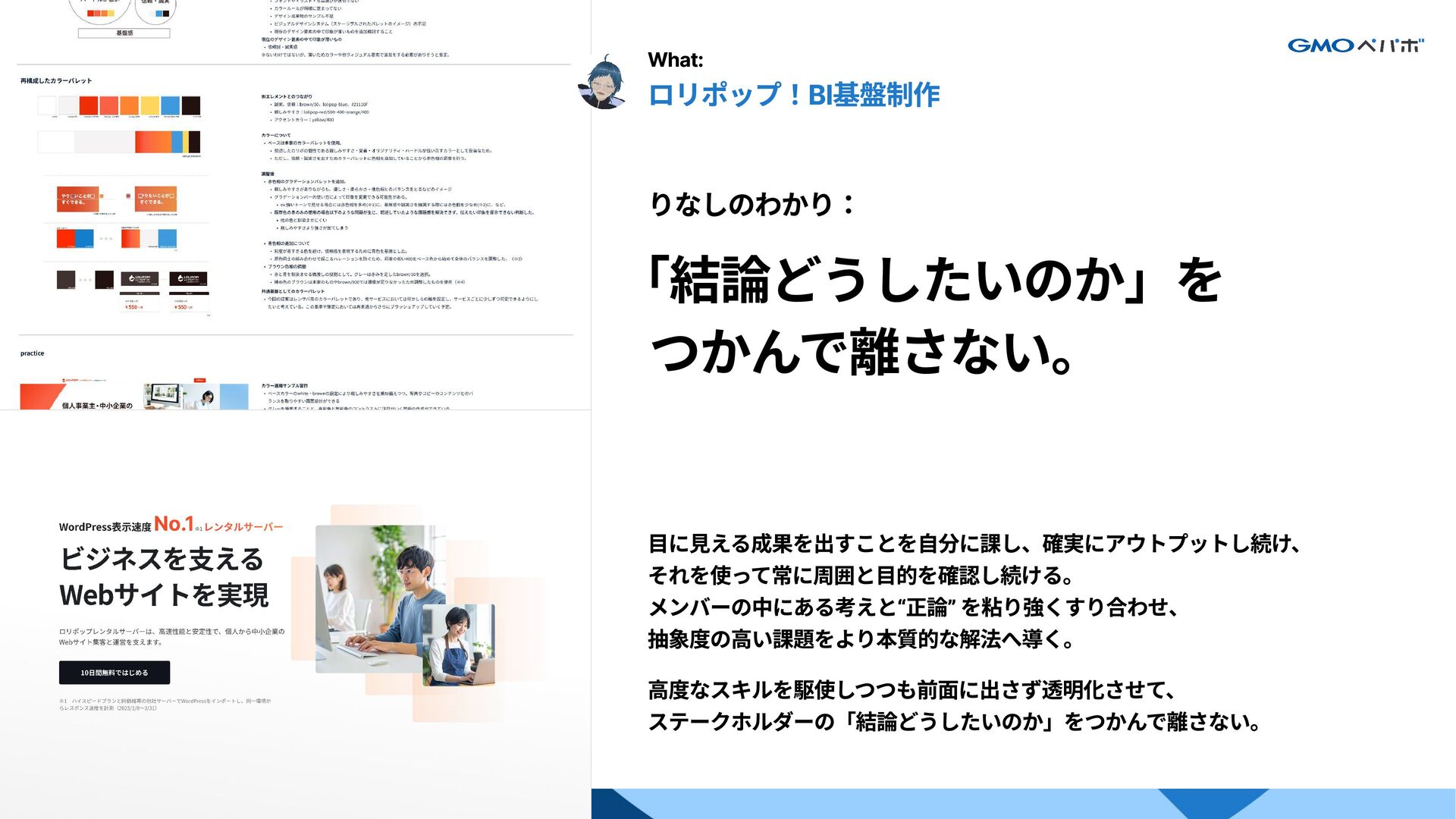 5. わかり手の例 What: ロリポップ!BI基盤制作 りなしのわかり: 「結論どうしたいのか」を   つかんで離さない。 目に見える成果を出すことを自分に課し、確実にアウトプットし続け、