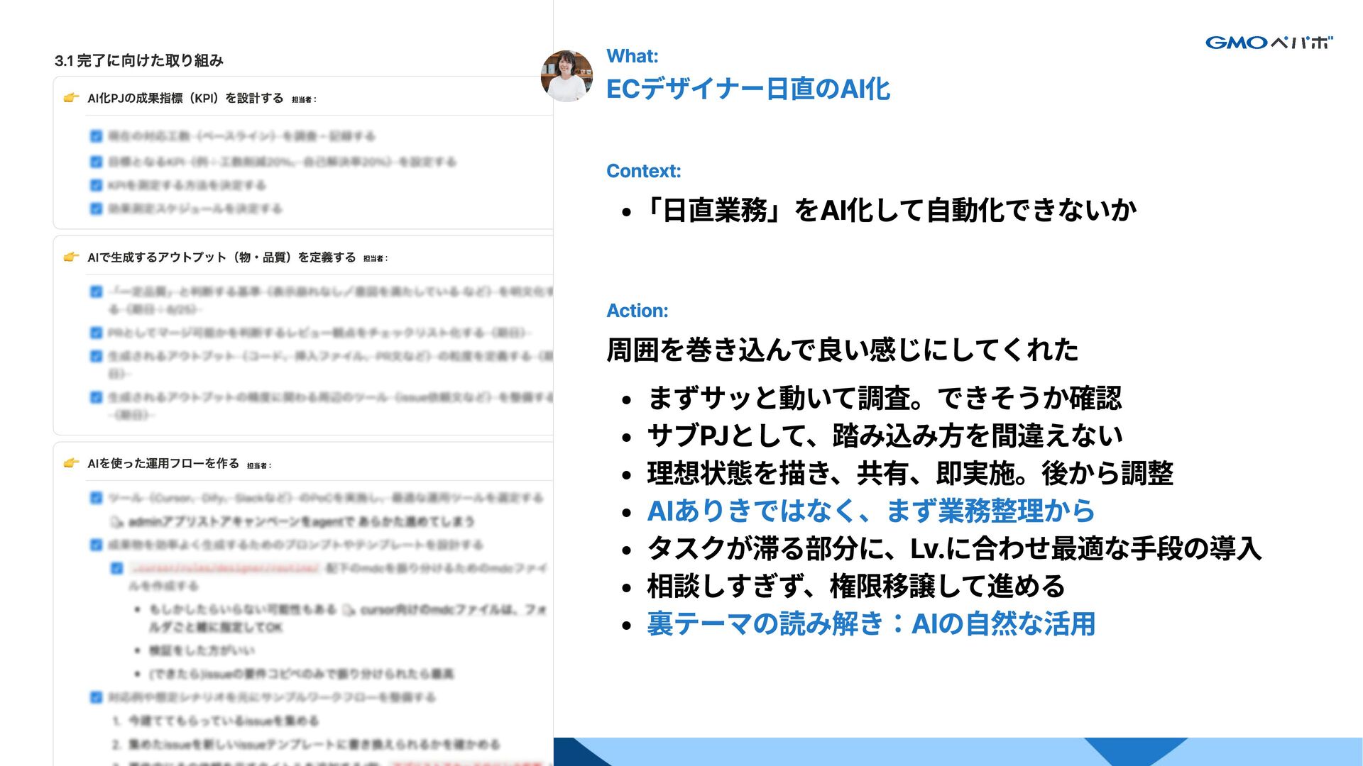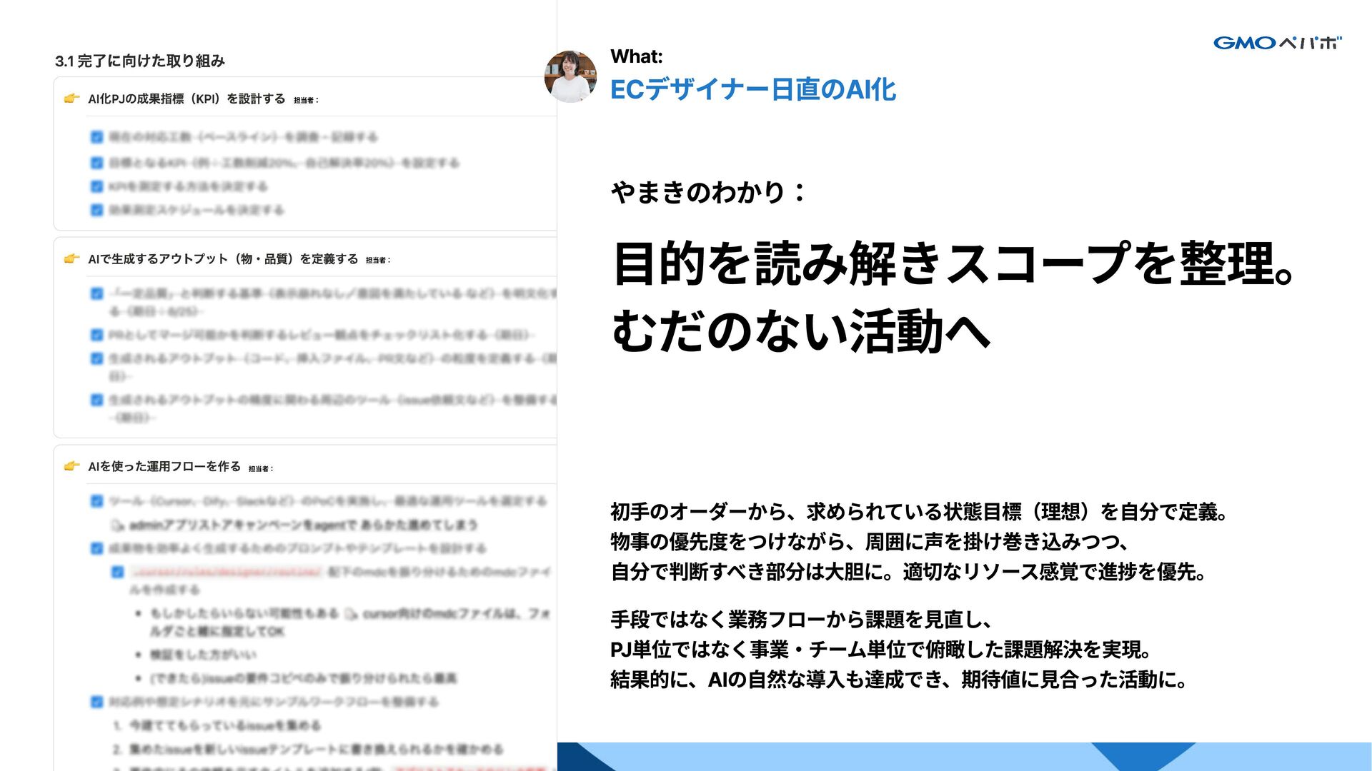 文書や図を効果的に使って構造化・巻き込み それを元に、結論どうしていきたいかを常に同期 1週間ごとに成果を出す。確実にアウトプット 相手の中に答えがある。常にそれを追いかける