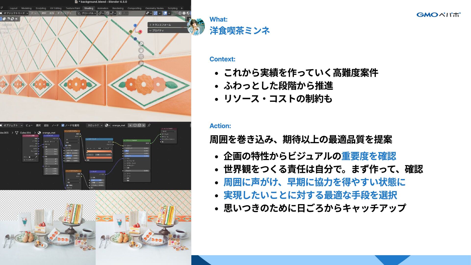 6. わかり手の例 What: 洋食喫茶ミンネ Context: Action: これから実績を作っていく高難度案件 ふわっとした段階から推進 リソース・コストの制約も 周囲を巻き込み、期待以上の最適品質を提案 企画の特性からビジュアルの