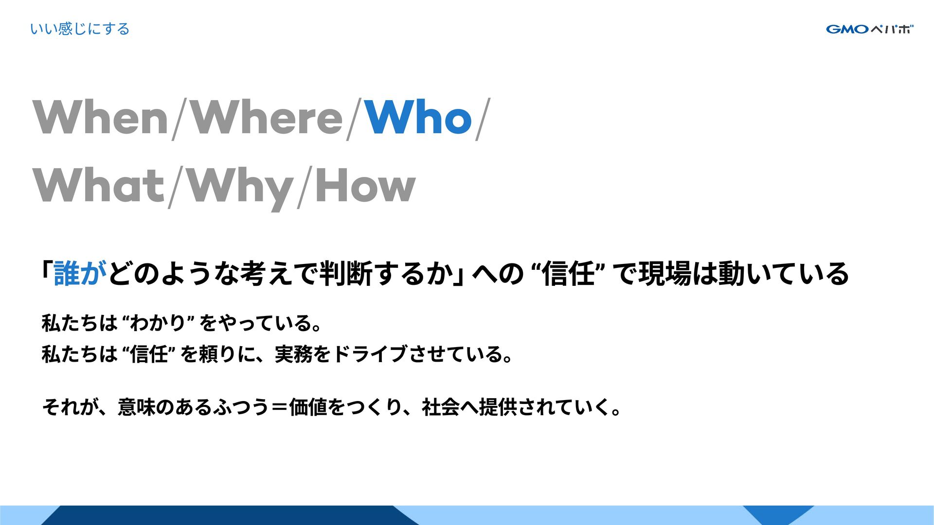 7. いい感じにする When/Where/ / What/Why/How Who 「 どのような考えで判断するか」への “信任” で現場は動いている 誰が