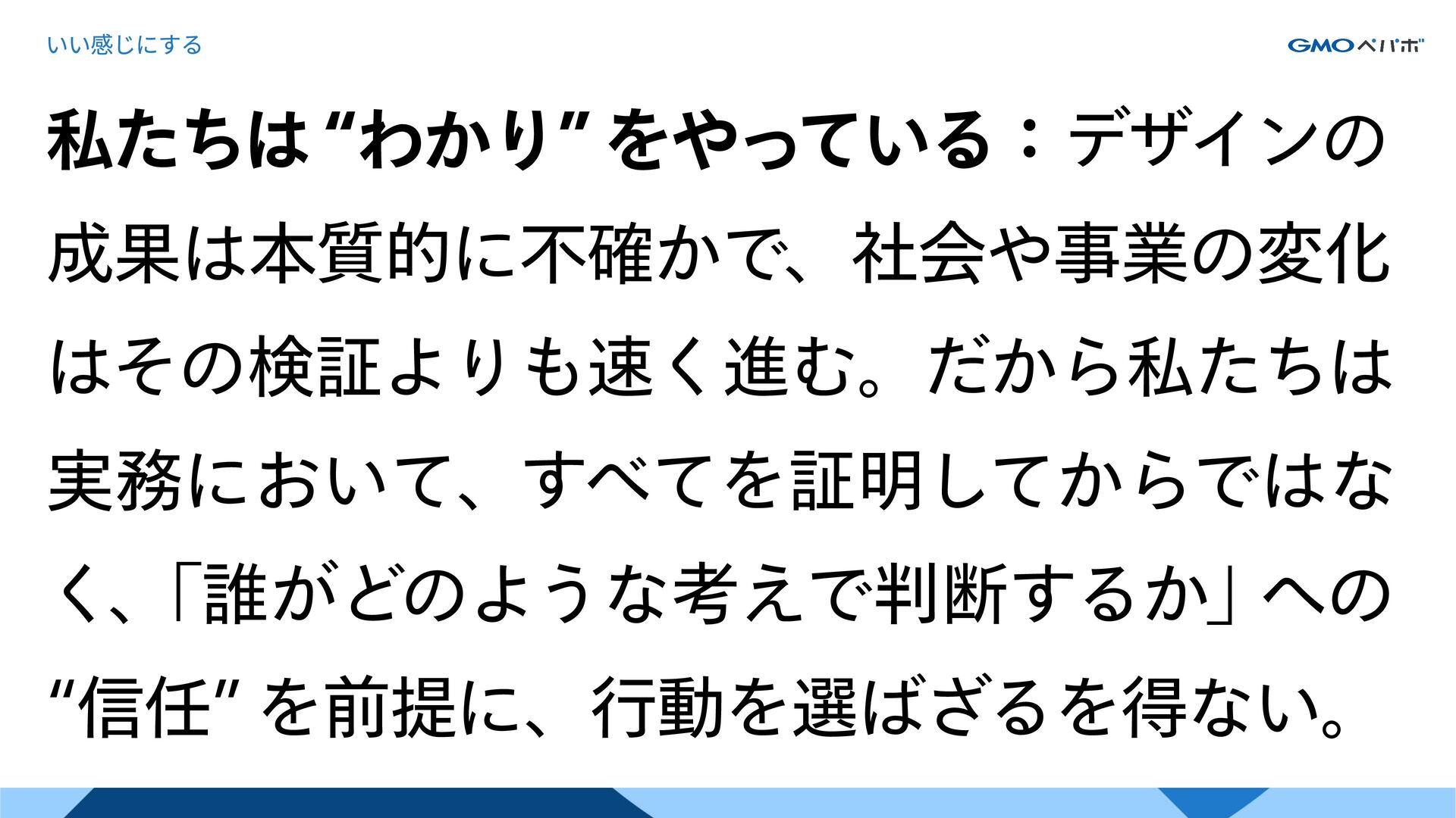 私たちは “わかり” をやっている。 私たちは “信任” を頼りに、実務をドライブさせている。 それが、意味のあるふつう=価値をつくり、社会へ提供されていく。