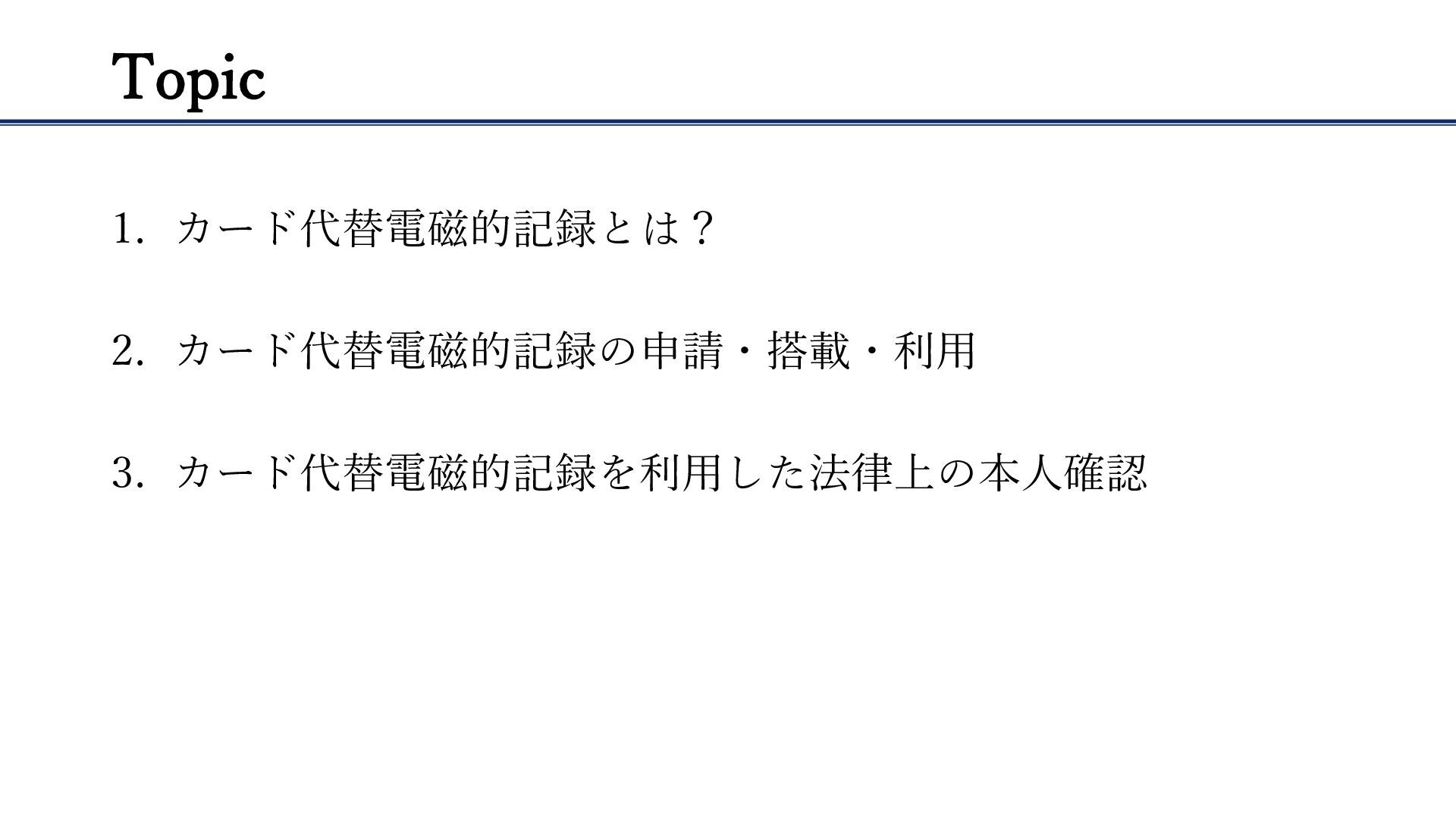 Topic 1. カード代替電磁的記録とは? 2. カード代替電磁的記録の申請・搭載・利用 3. カード代替電磁的記録を利用した法律上の本人確認