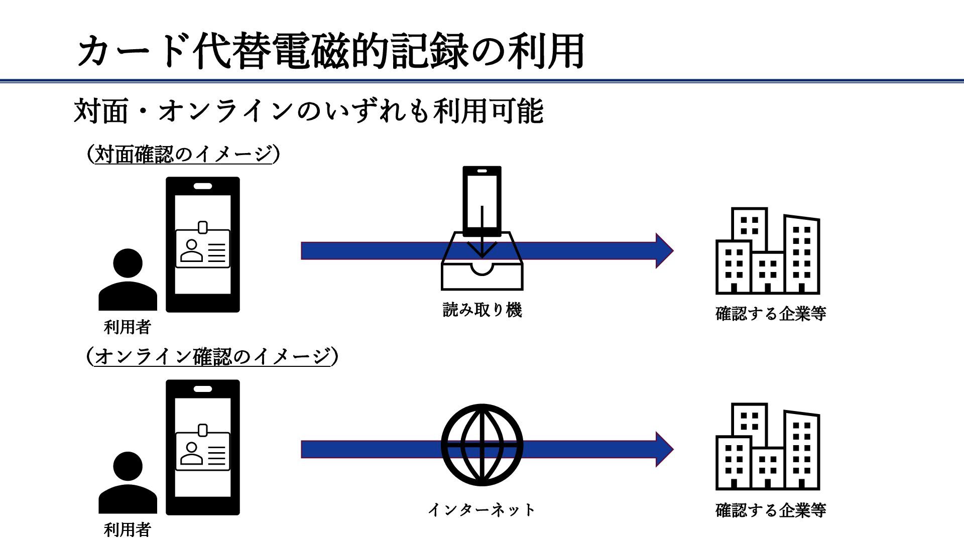 カード代替電磁的記録の利用 対面・オンラインのいずれも利用可能 利用者 利用者 確認する企業等 確認する企業等 読み取り機 インターネット (対面確認のイメージ) (オンライン確認のイメージ)