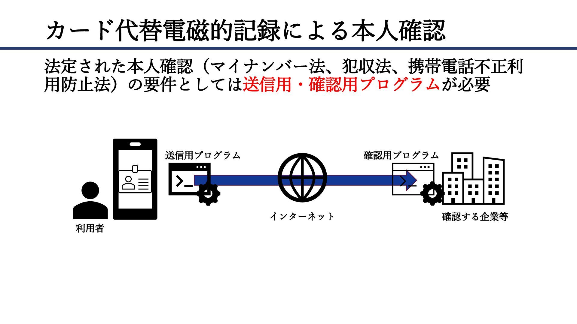 カード代替電磁的記録による本人確認 法定された本人確認(マイナンバー法、犯収法、携帯電話不正利 用防止法)の要件としては送信用・確認用プログラムが必要 利用者 確認する企業等 インターネット 送信用プログラム 確認用プログラム
