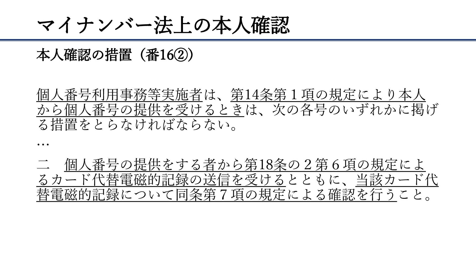 マイナンバー法上の本人確認 本人確認の措置(番16②) 個人番号利用事務等実施者は、第14条第1項の規定により本人 から個人番号の提供を受けるときは、次の各号のいずれかに掲げ る措置をとらなければならない。 … 二 個人番号の提供をする者から第18条の2第6項の規定によ るカード代替電磁的記録の送信を受けるとともに、当該カード代 替電磁的記録について同条第7項の規定による確認を行うこと。