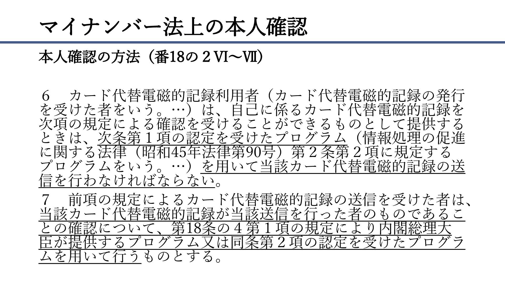 マイナンバー法上の本人確認 本人確認の方法(番18の2Ⅵ~Ⅶ) 6 カード代替電磁的記録利用者(カード代替電磁的記録の発行 を受けた者をいう。…)は、自己に係るカード代替電磁的記録を 次項の規定による確認を受けることができるものとして提供する ときは、次条第1項の認定を受けたプログラム(情報処理の促進 に関する法律(昭和45年法律第90号)第2条第2項に規定する プログラムをいう。…)を用いて当該カード代替電磁的記録の送 信を行わなければならない。
