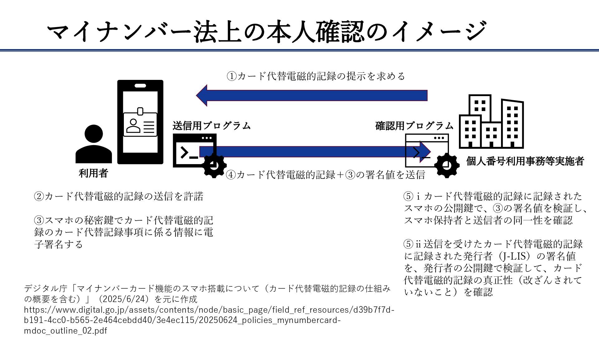 マイナンバー法上の本人確認のイメージ デジタル庁「マイナンバーカード機能のスマホ搭載について(カード代替電磁的記録の仕組み の概要を含む)」(2025/6/24)を元に作成 https://www.digital.go.jp/assets/contents/node/basic_page/field_ref_resources/d39b7f7d- b191-4cc0-b565-2e464cebdd40/3e4ec115/20250624_policies_mynumbercard- mdoc_outline_02.pdf 利用者 個人番号利用事務等実施者 送信用プログラム 確認用プログラム