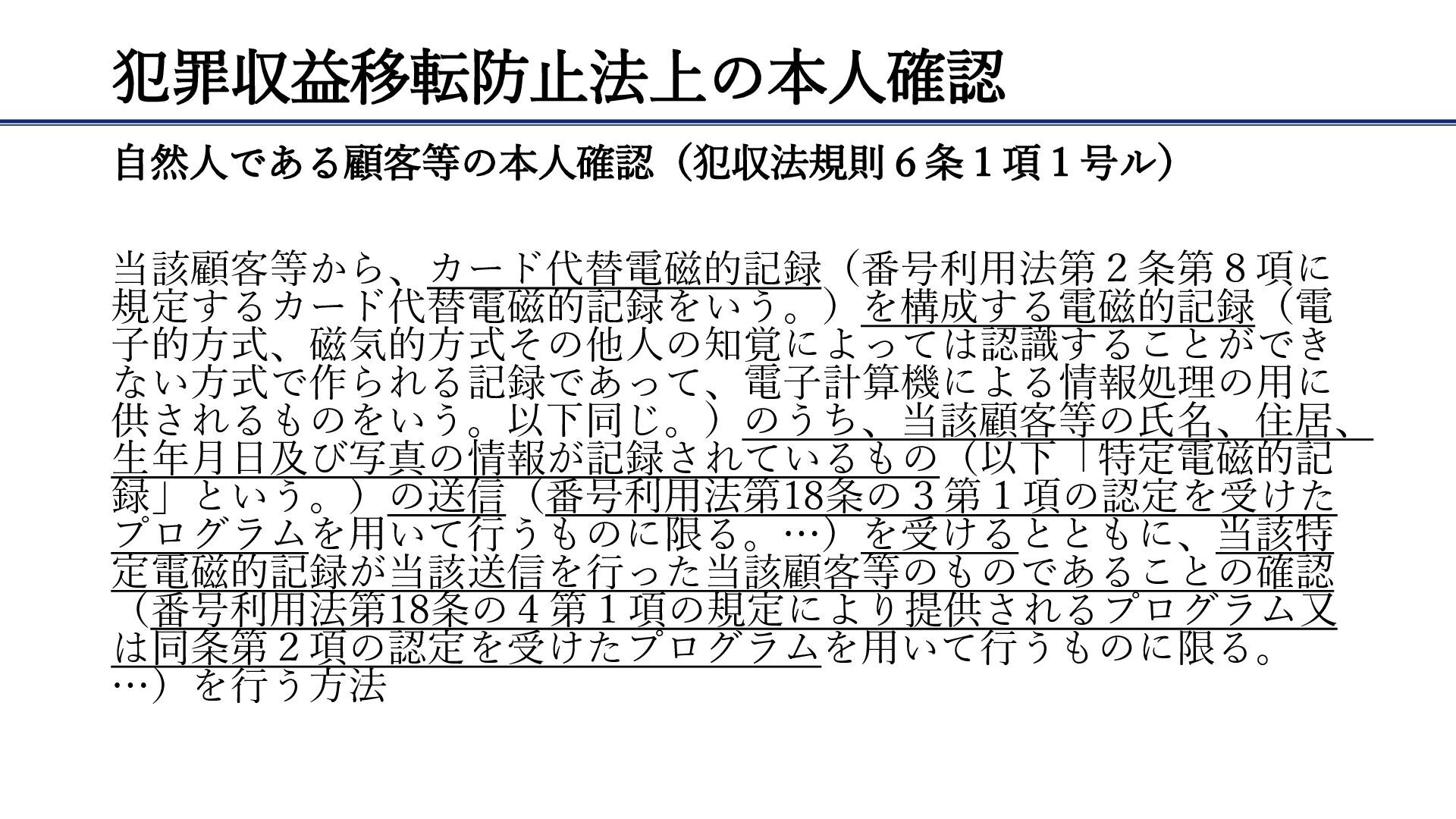 犯罪収益移転防止法上の本人確認 自然人である顧客等の本人確認(犯収法規則6条1項1号ル) 当該顧客等から、カード代替電磁的記録(番号利用法第2条第8項に 規定するカード代替電磁的記録をいう。)を構成する電磁的記録(電 子的方式、磁気的方式その他人の知覚によっては認識することができ ない方式で作られる記録であって、電子計算機による情報処理の用に 供されるものをいう。以下同じ。)のうち、当該顧客等の氏名、住居、 生年月日及び写真の情報が記録されているもの(以下「特定電磁的記 録」という。)の送信(番号利用法第18条の3第1項の認定を受けた プログラムを用いて行うものに限る。…)を受けるとともに、当該特
