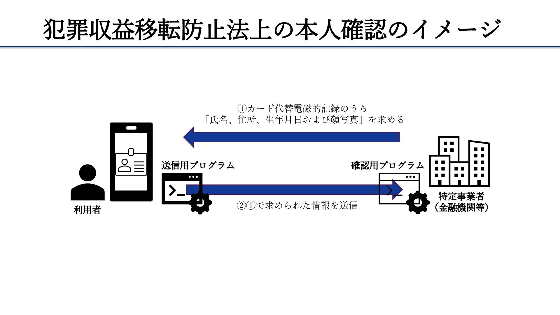 犯罪収益移転防止法上の本人確認のイメージ 利用者 特定事業者 (金融機関等) 送信用プログラム 確認用プログラム ①カード代替電磁的記録のうち 「氏名、住所、生年月日および顔写真」を求める ②①で求められた情報を送信