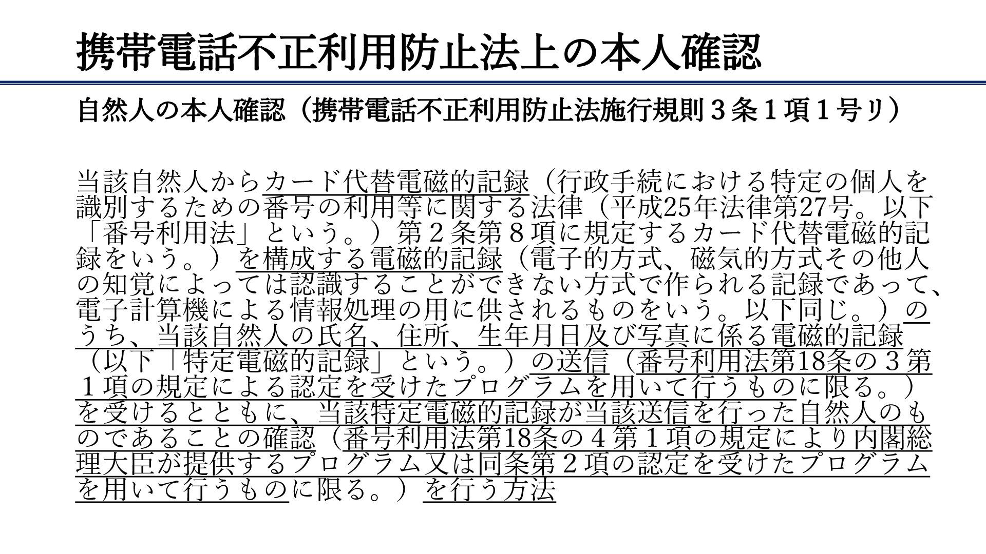 携帯電話不正利用防止法上の本人確認 自然人の本人確認(携帯電話不正利用防止法施行規則3条1項1号リ) 当該自然人からカード代替電磁的記録(行政手続における特定の個人を 識別するための番号の利用等に関する法律(平成25年法律第27号。以下 「番号利用法」という。)第2条第8項に規定するカード代替電磁的記 録をいう。)を構成する電磁的記録(電子的方式、磁気的方式その他人 の知覚によっては認識することができない方式で作られる記録であって、 電子計算機による情報処理の用に供されるものをいう。以下同じ。)の うち、当該自然人の氏名、住所、生年月日及び写真に係る電磁的記録 (以下「特定電磁的記録」という。)の送信(番号利用法第18条の3第