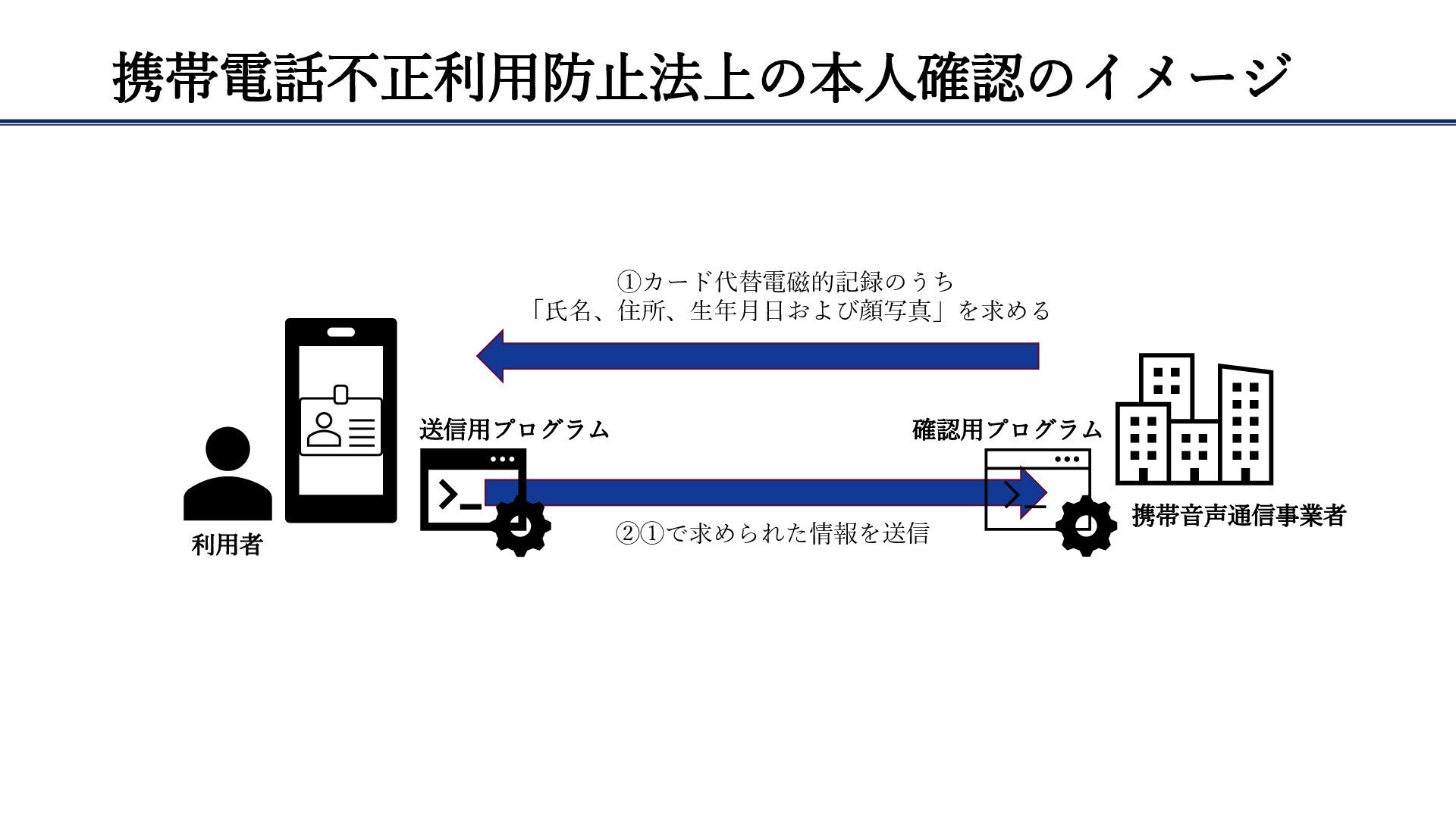 携帯電話不正利用防止法上の本人確認のイメージ 利用者 携帯音声通信事業者 送信用プログラム 確認用プログラム ①カード代替電磁的記録のうち 「氏名、住所、生年月日および顔写真」を求める ②①で求められた情報を送信