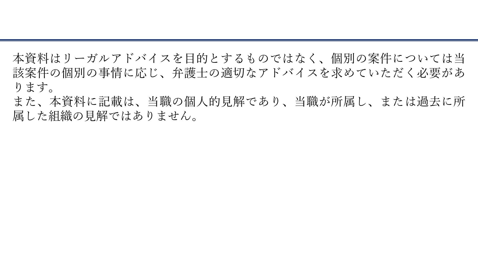 本資料はリーガルアドバイスを目的とするものではなく、個別の案件については当 該案件の個別の事情に応じ、弁護士の適切なアドバイスを求めていただく必要があ ります。 また、本資料に記載は、当職の個人的見解であり、当職が所属し、または過去に所 属した組織の見解ではありません。