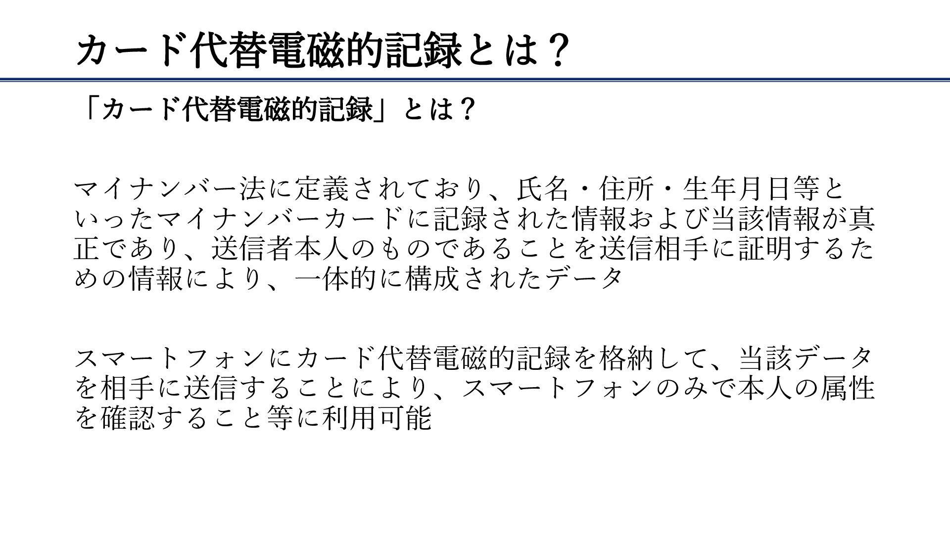 カード代替電磁的記録とは? 「カード代替電磁的記録」とは? マイナンバー法に定義されており、氏名・住所・生年月日等と いったマイナンバーカードに記録された情報および当該情報が真 正であり、送信者本人のものであることを送信相手に証明するた めの情報により、一体的に構成されたデータ スマートフォンにカード代替電磁的記録を格納して、当該データ を相手に送信することにより、スマートフォンのみで本人の属性 を確認すること等に利用可能