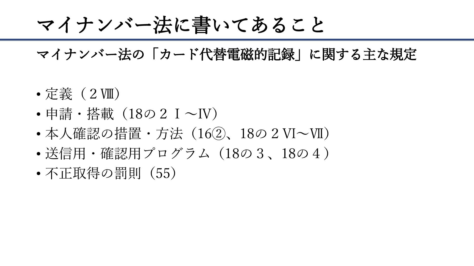 マイナンバー法に書いてあること マイナンバー法の「カード代替電磁的記録」に関する主な規定 • 定義(2Ⅷ) • 申請・搭載(18の2Ⅰ~Ⅳ) • 本人確認の措置・方法(16②、18の2Ⅵ~Ⅶ) • 送信用・確認用プログラム(18の3、18の4)