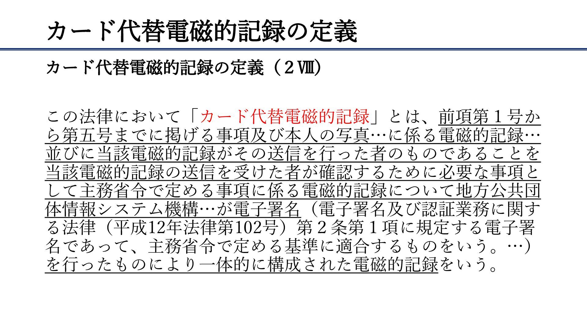 カード代替電磁的記録の定義 カード代替電磁的記録の定義(2Ⅷ) この法律において「カード代替電磁的記録」とは、前項第1号か ら第五号までに掲げる事項及び本人の写真…に係る電磁的記録… 並びに当該電磁的記録がその送信を行った者のものであることを 当該電磁的記録の送信を受けた者が確認するために必要な事項と して主務省令で定める事項に係る電磁的記録について地方公共団 体情報システム機構…が電子署名(電子署名及び認証業務に関す る法律(平成12年法律第102号)第2条第1項に規定する電子署 名であって、主務省令で定める基準に適合するものをいう。…)
