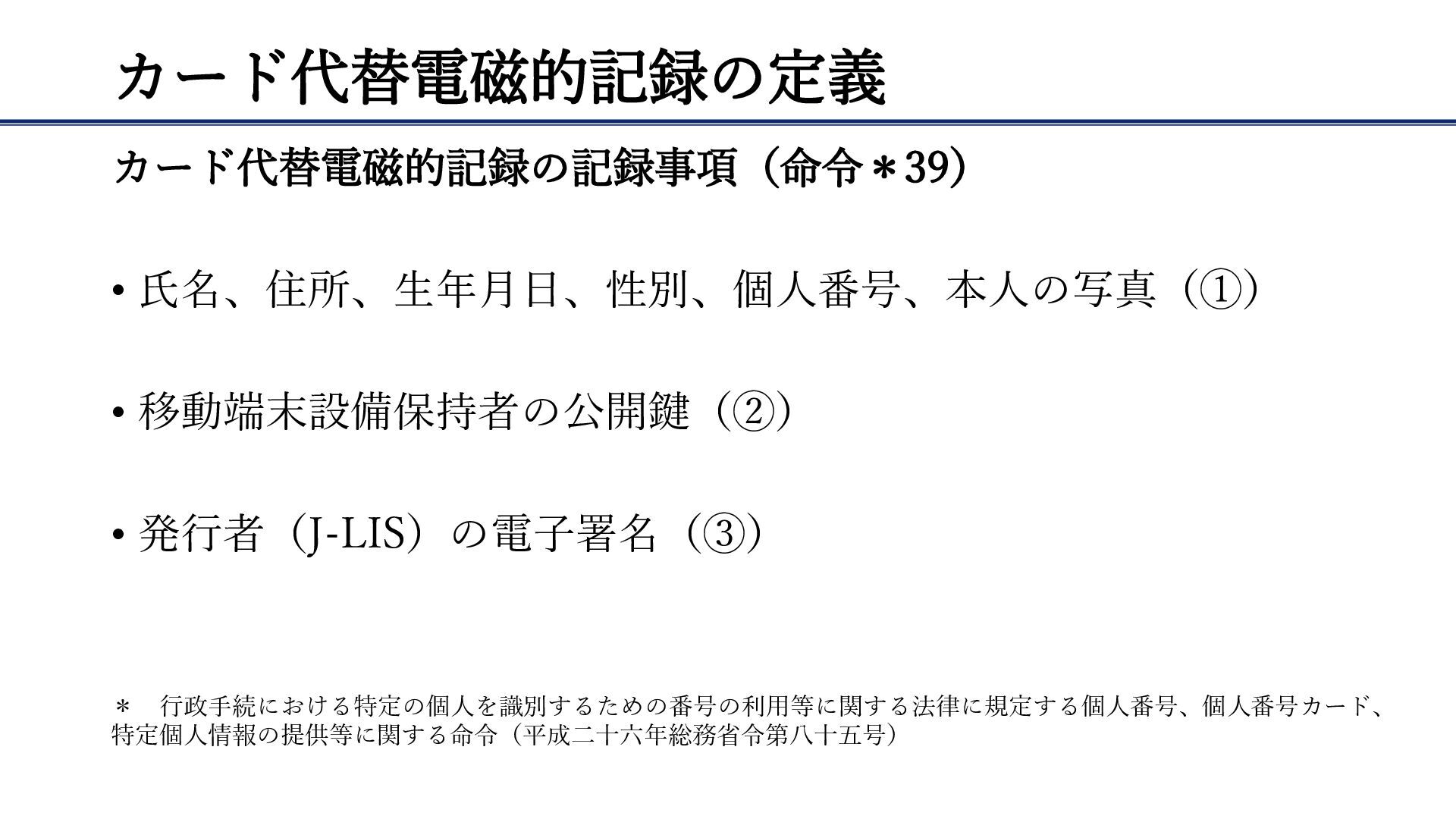 カード代替電磁的記録の定義 カード代替電磁的記録の記録事項(命令*39) • 氏名、住所、生年月日、性別、個人番号、本人の写真(①) • 移動端末設備保持者の公開鍵(②) • 発行者(J-LIS)の電子署名(③) * 行政手続における特定の個人を識別するための番号の利用等に関する法律に規定する個人番号、個人番号カード、