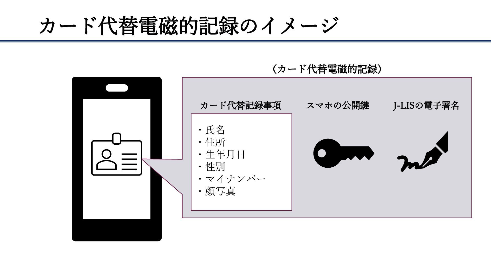 カード代替電磁的記録のイメージ ・氏名 ・住所 ・生年月日 ・性別 ・マイナンバー ・顔写真 (カード代替電磁的記録) カード代替記録事項 スマホの公開鍵