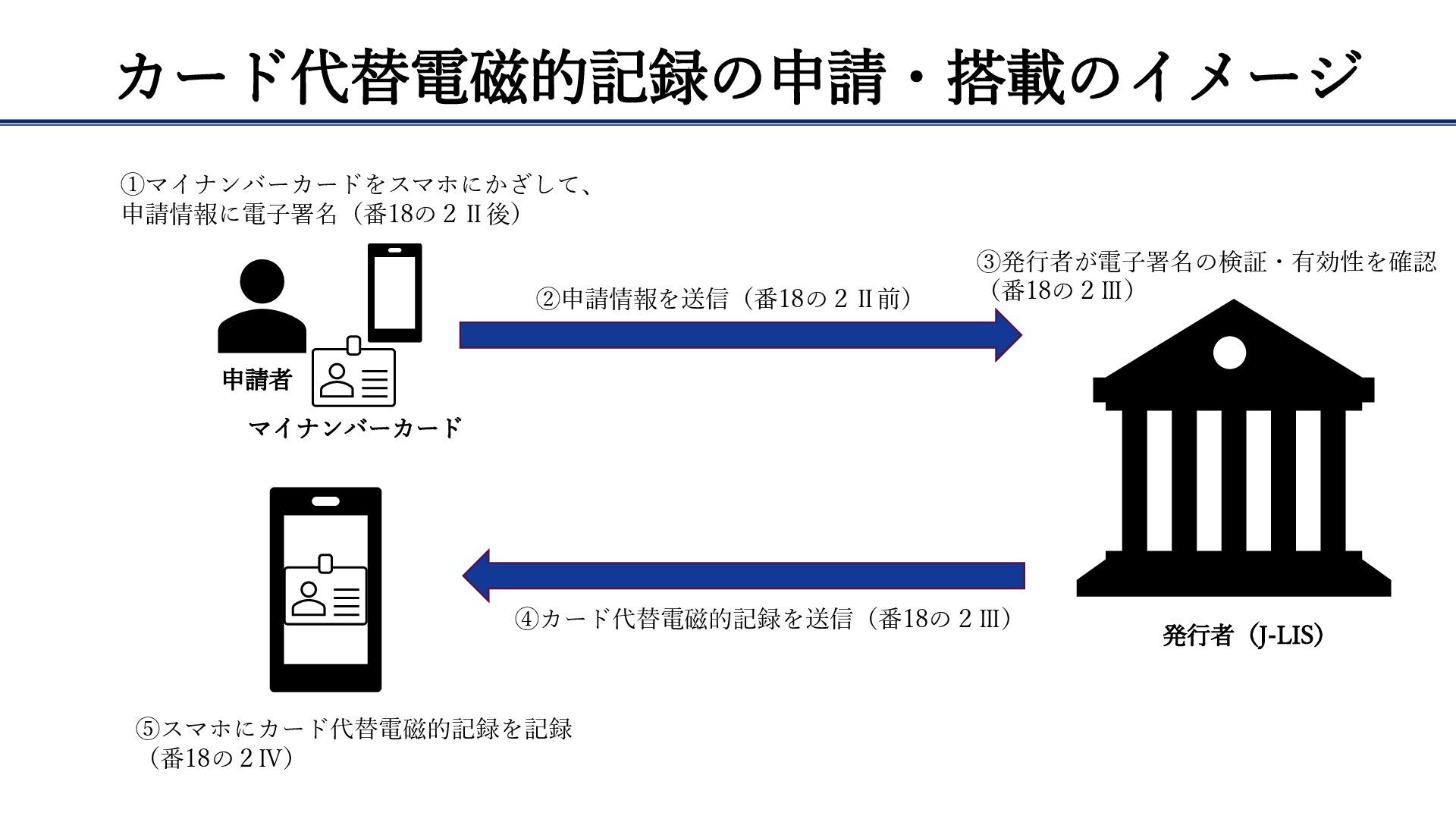 カード代替電磁的記録の申請・搭載のイメージ 申請者 マイナンバーカード ①マイナンバーカードをスマホにかざして、 申請情報に電子署名(番18の2Ⅱ後) ②申請情報を送信(番18の2Ⅱ前) ③発行者が電子署名の検証・有効性を確認 (番18の2Ⅲ) 発行者(J-LIS) ④カード代替電磁的記録を送信(番18の2Ⅲ)