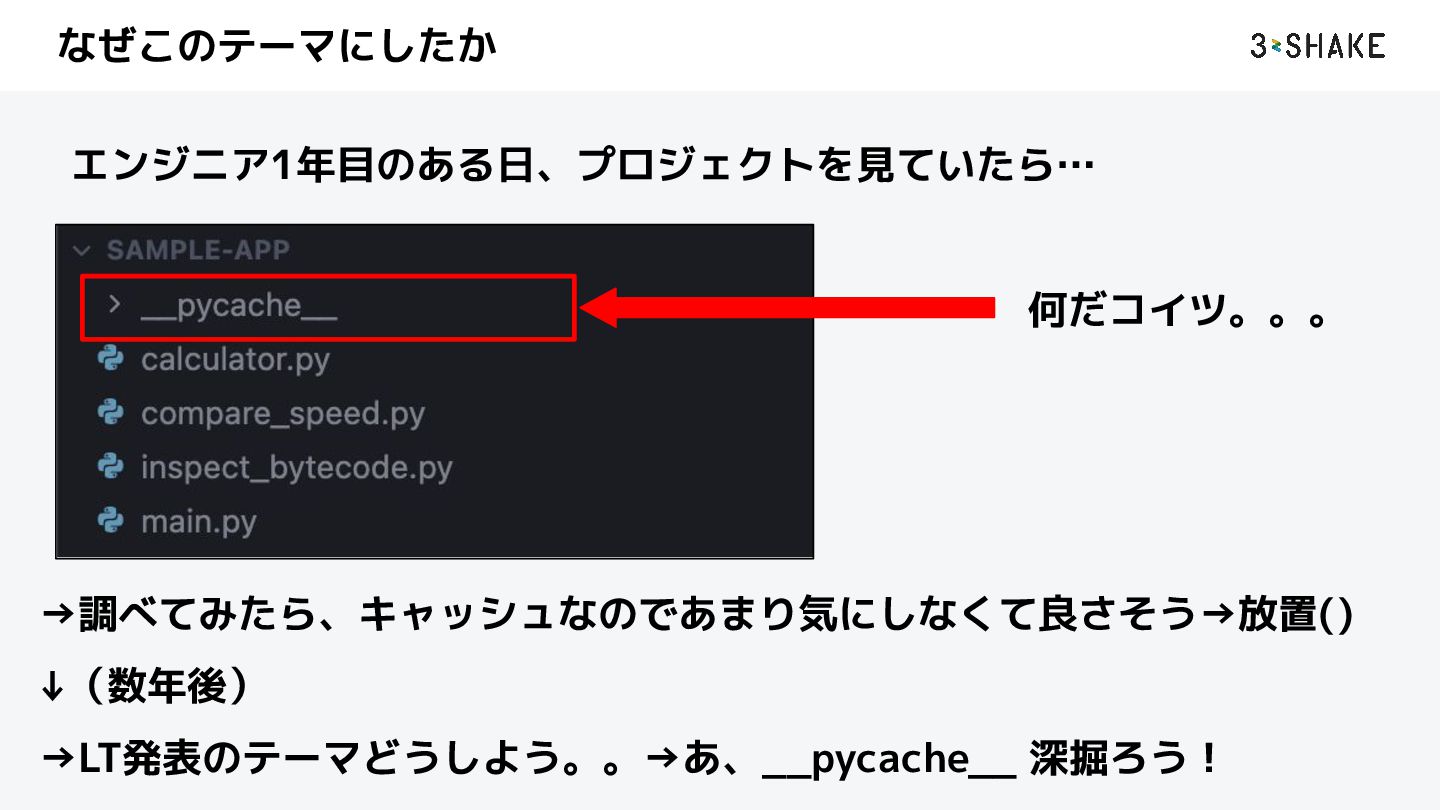 なぜこのテーマにしたか エンジニア1年目のある日、プロジェクトを見ていたら… 何だコイツ。。。 →調べてみたら、キャッシュなのであまり気にしなくて良さそう→放置() ↓(数年後) →LT発表のテーマどうしよう。。→あ、__pycache__ 深掘ろう!