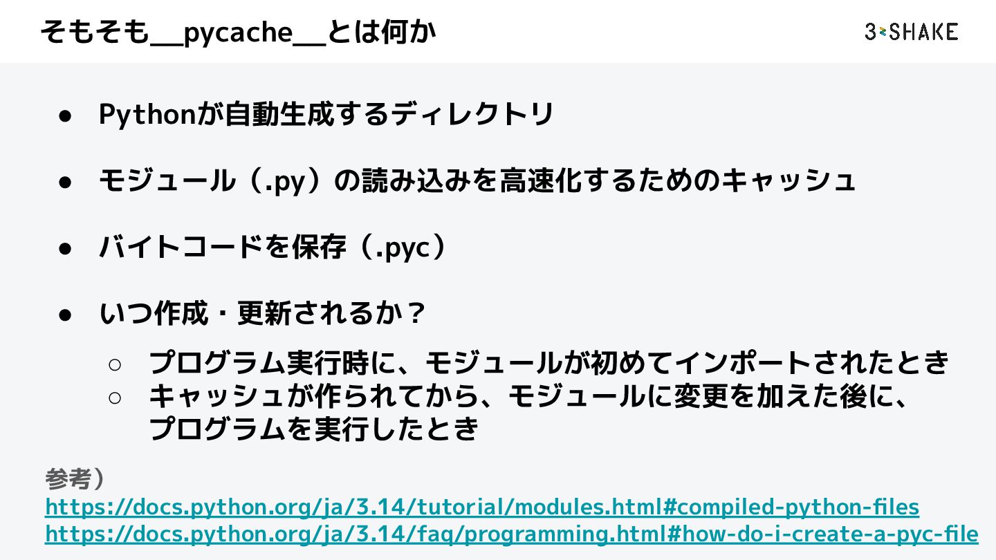 そもそも__pycache__とは何か • Pythonが自動生成するディレクトリ • モジュール(.py)の読み込みを高速化するためのキャッシュ • バイトコードを保存(.pyc) • いつ作成・更新されるか? ◦