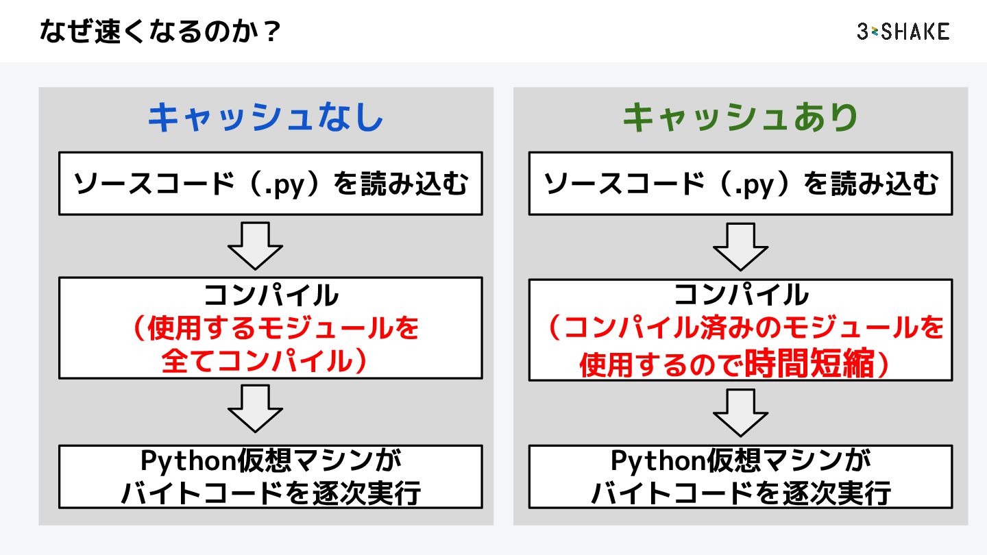 なぜ速くなるのか? キャッシュなし キャッシュあり ソースコード(.py)を読み込む コンパイル (使用するモジュールを 全てコンパイル) Python仮想マシンが バイトコードを逐次実行 ソースコード(.py)を読み込む