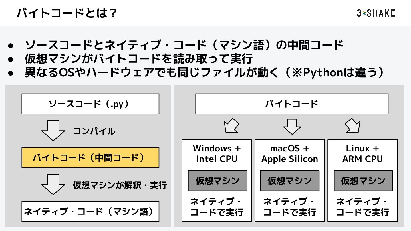 バイトコードとは? • ソースコードとネイティブ・コード(マシン語)の中間コード • 仮想マシンがバイトコードを読み取って実行 • 異なるOSやハードウェアでも同じファイルが動く(※Pythonは違う) ソースコード(.py) ネイティブ・コード(マシン語) バイトコード(中間コード)