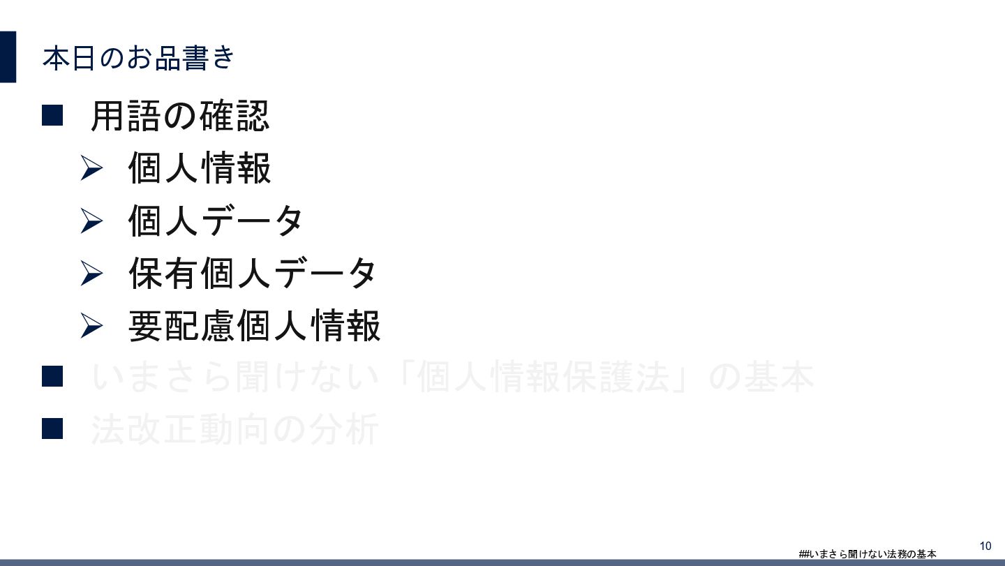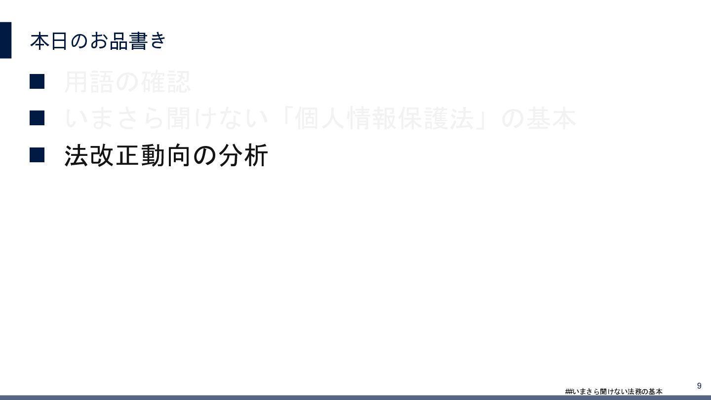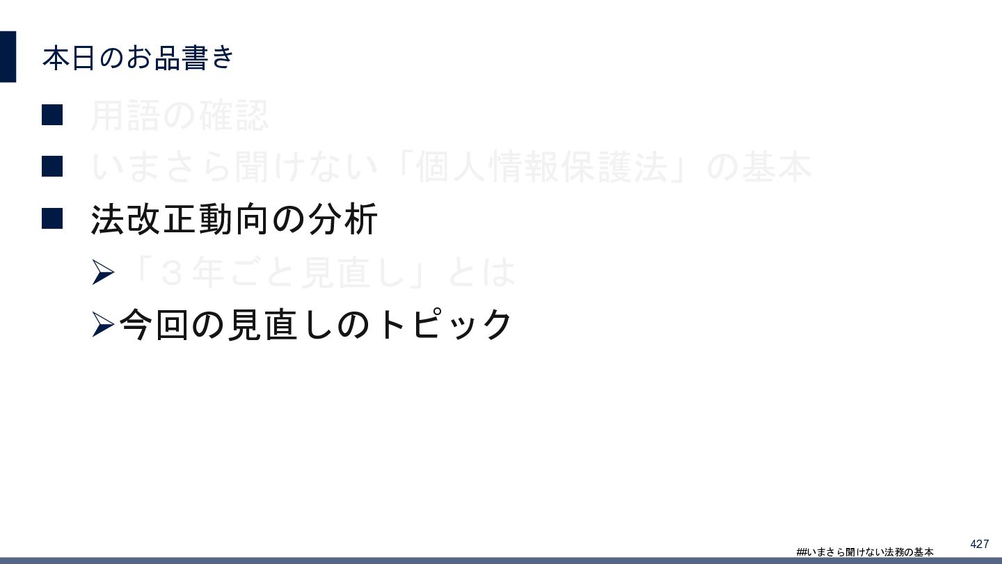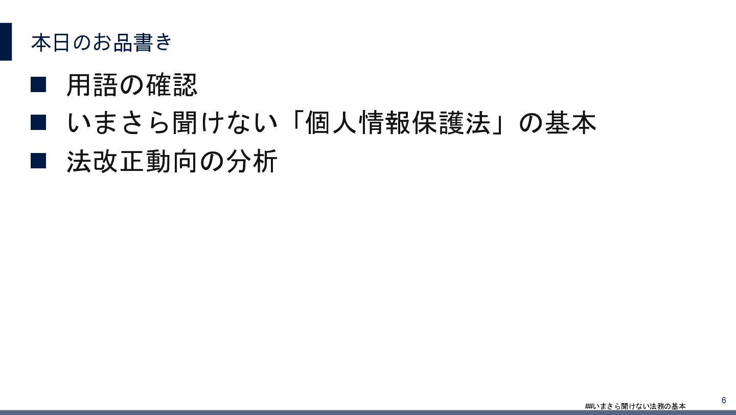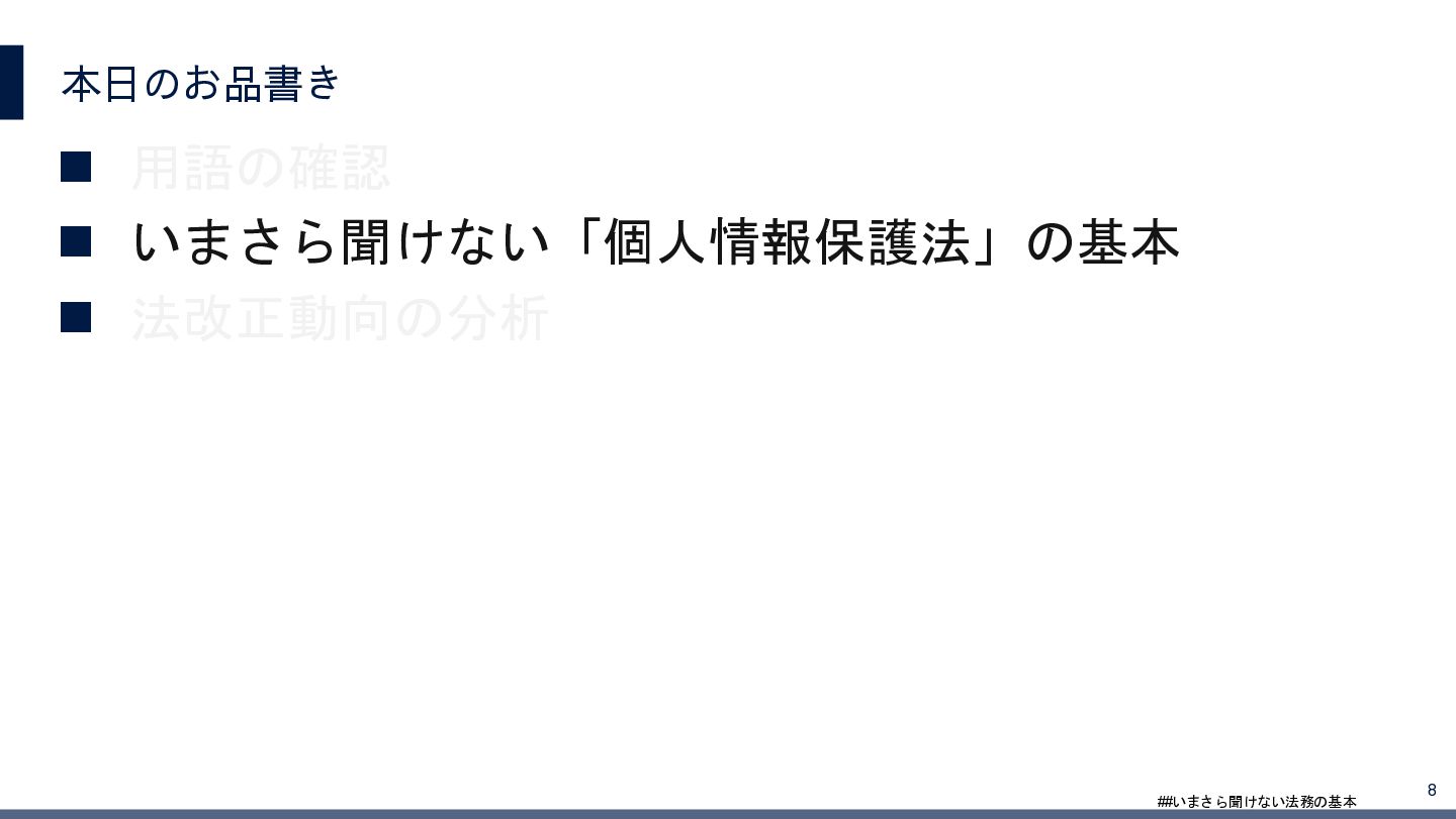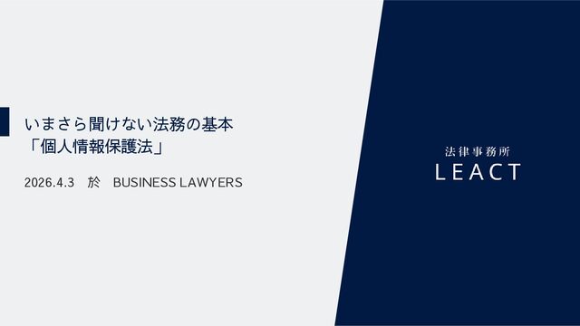 4/3(金)の12:00-13:30においてBUSINESS LAWYERS / 弁護士ドットコム株式会社様で実施した、 「いまさら聞けない法務の基本「個人情報保護法」」の登壇資料です。 https://www.businesslawyers.jp/seminars/553