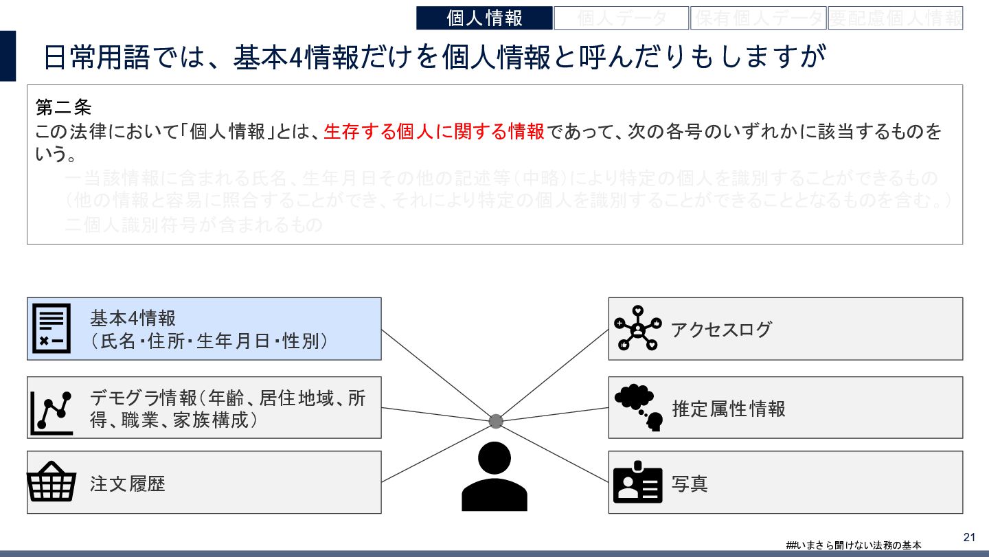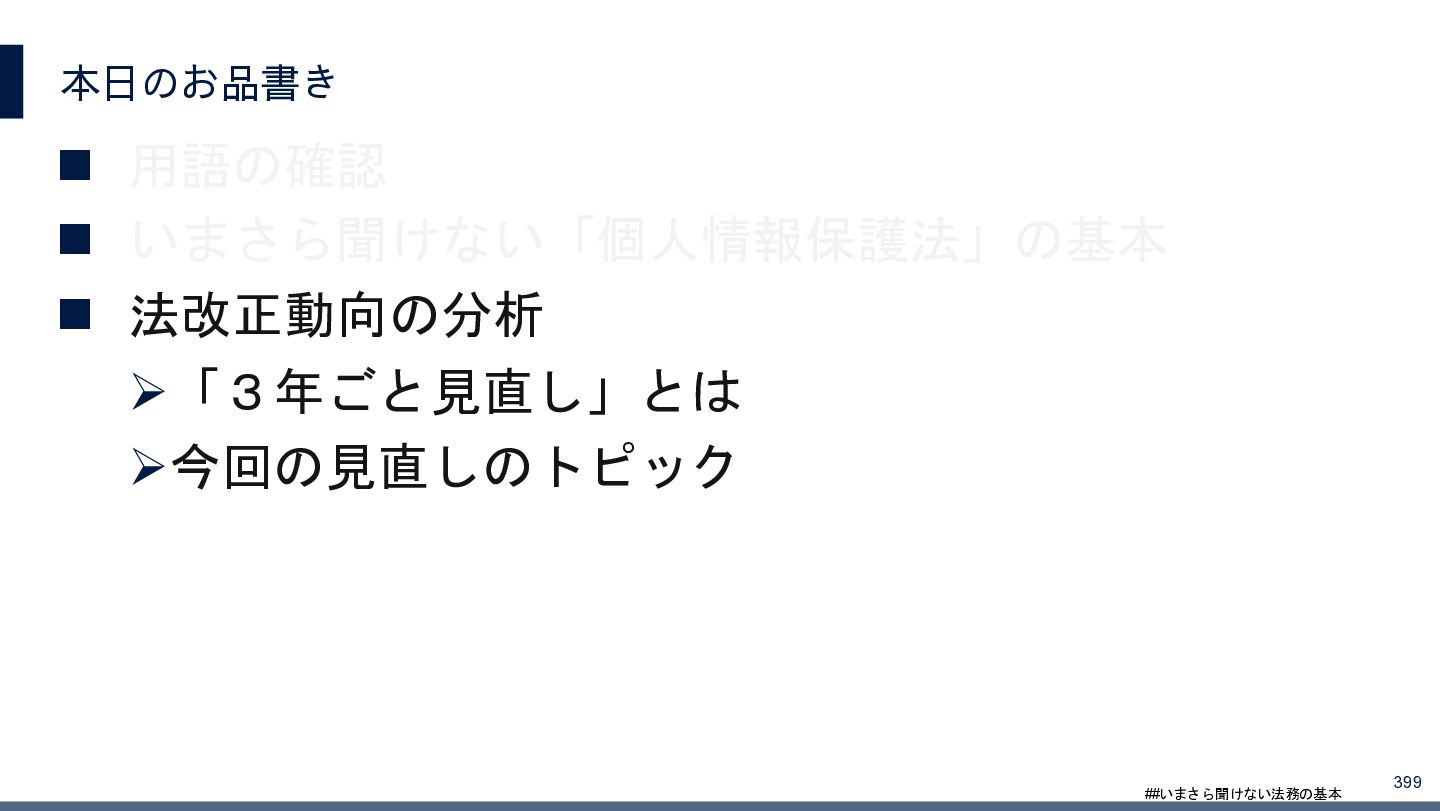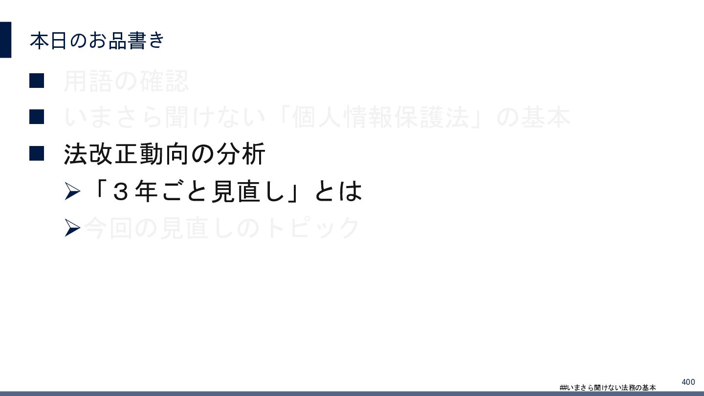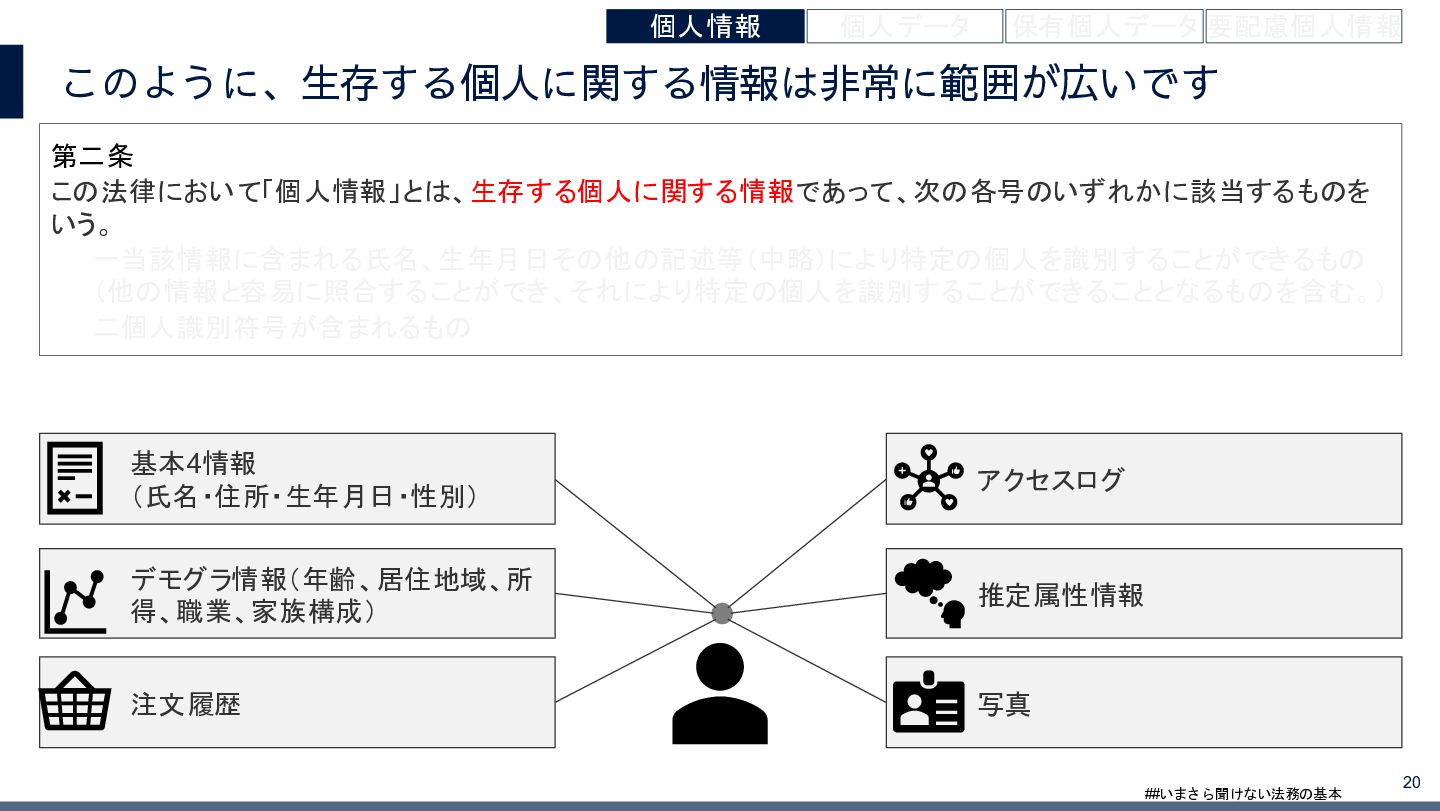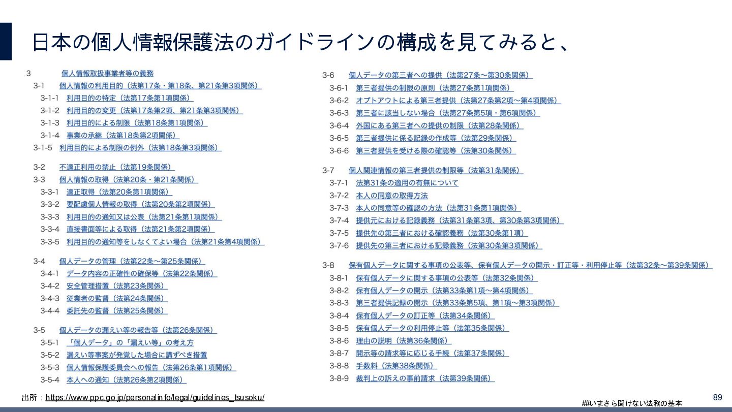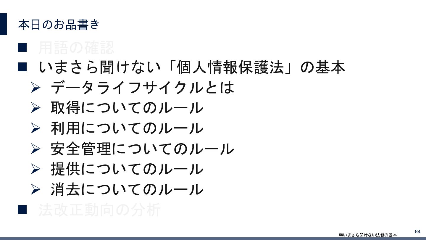 4/3(金)の12:00-13:30においてBUSINESS LAWYERS / 弁護士ドットコム株式会社様で実施した、 「いまさら聞けない法務の基本「個人情報保護法」」の登壇資料です。 https://www.businesslawyers.jp/seminars/553