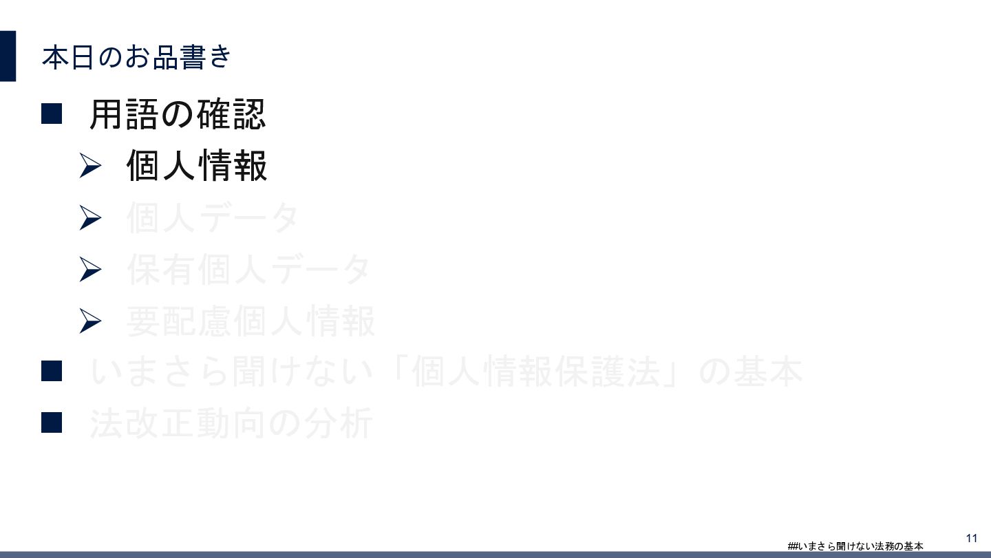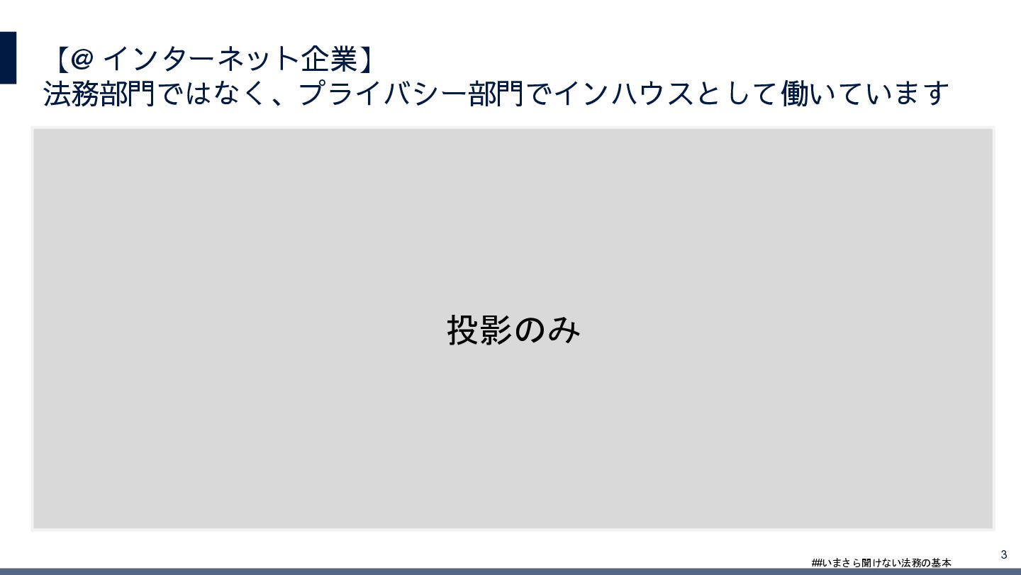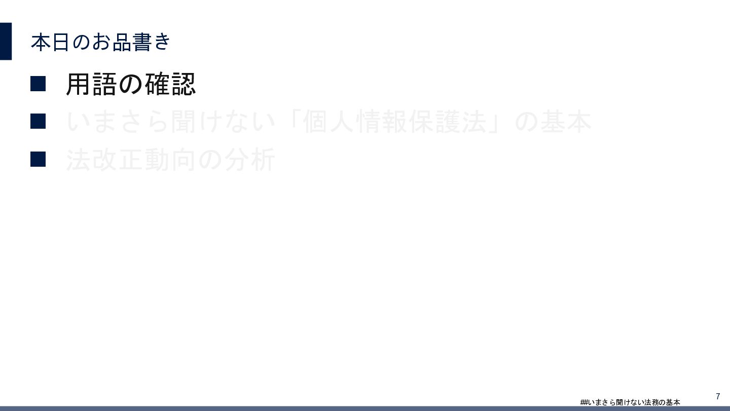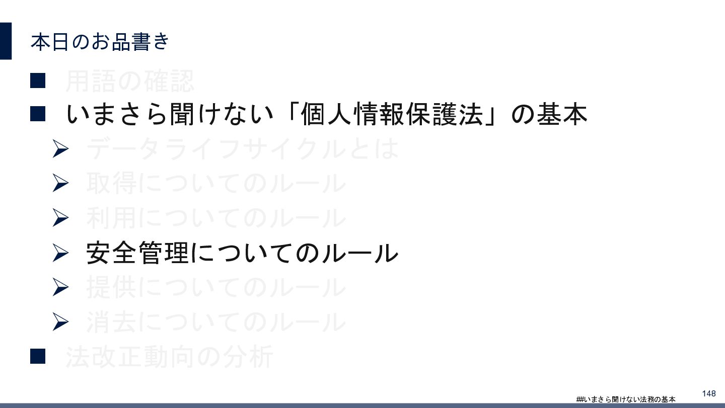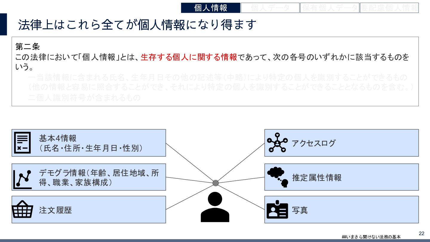 4/3(金)の12:00-13:30においてBUSINESS LAWYERS / 弁護士ドットコム株式会社様で実施した、 「いまさら聞けない法務の基本「個人情報保護法」」の登壇資料です。 https://www.businesslawyers.jp/seminars/553