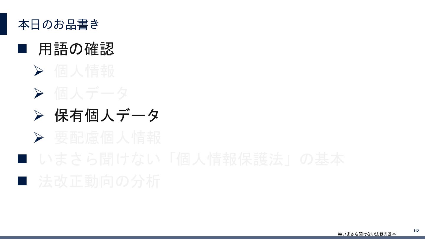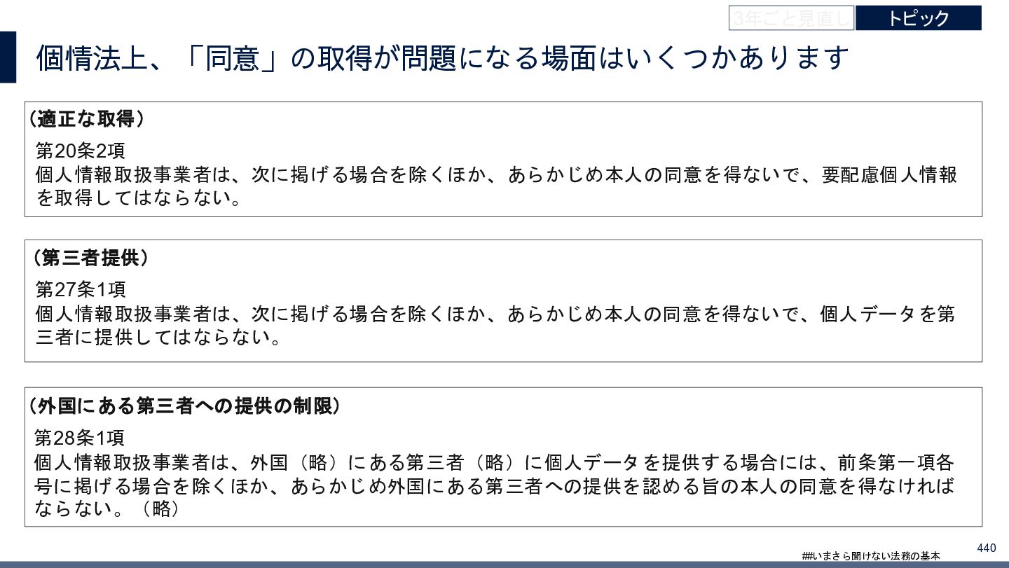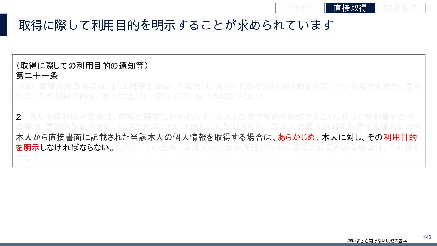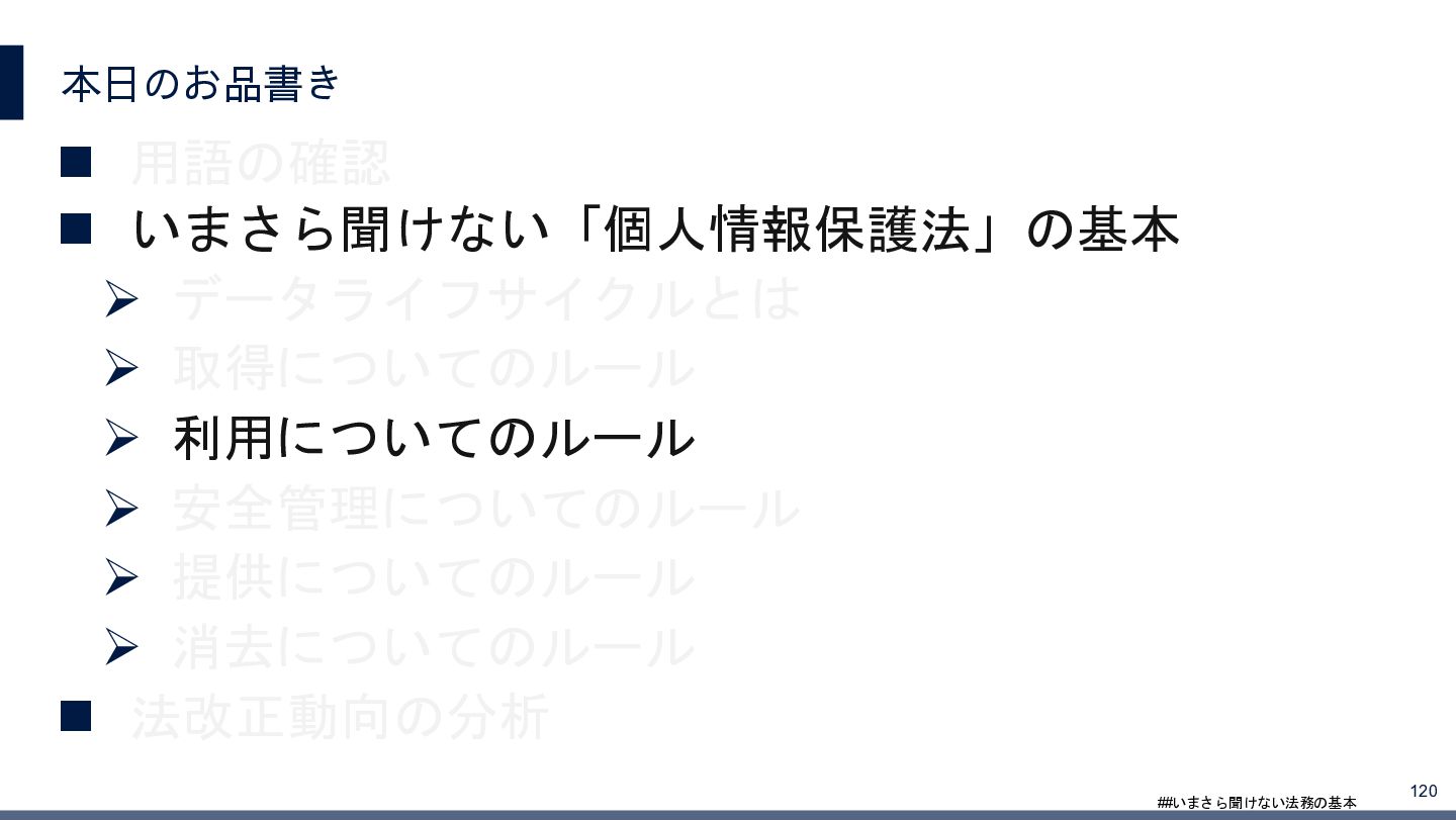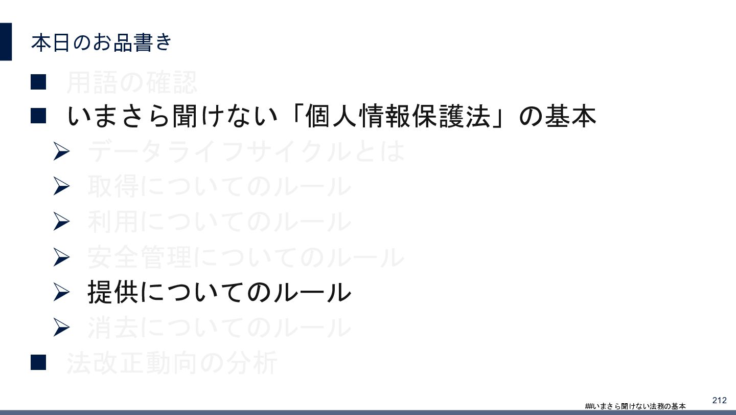 4/3(金)の12:00-13:30においてBUSINESS LAWYERS / 弁護士ドットコム株式会社様で実施した、 「いまさら聞けない法務の基本「個人情報保護法」」の登壇資料です。 https://www.businesslawyers.jp/seminars/553
