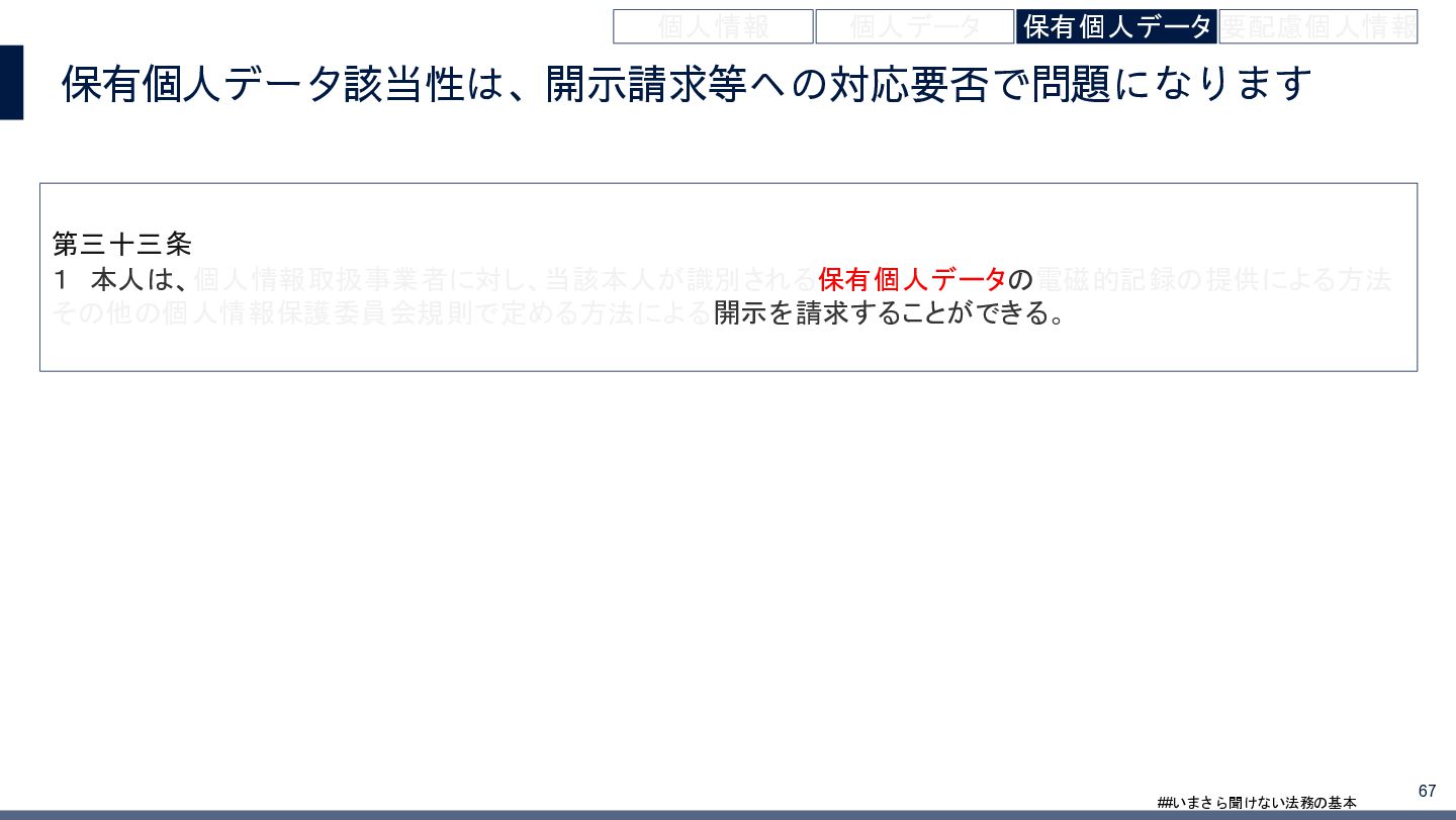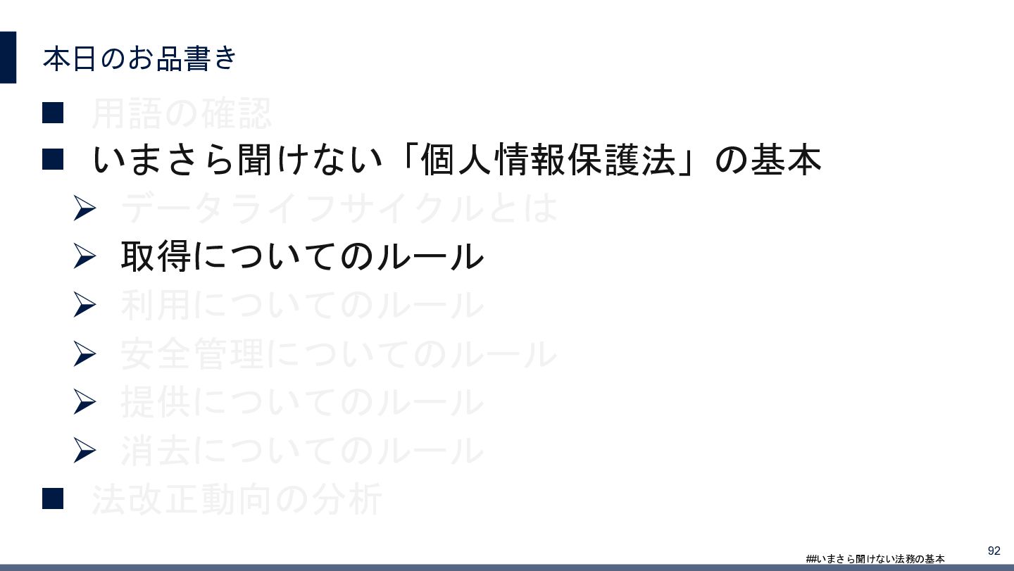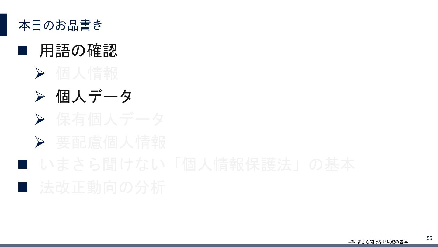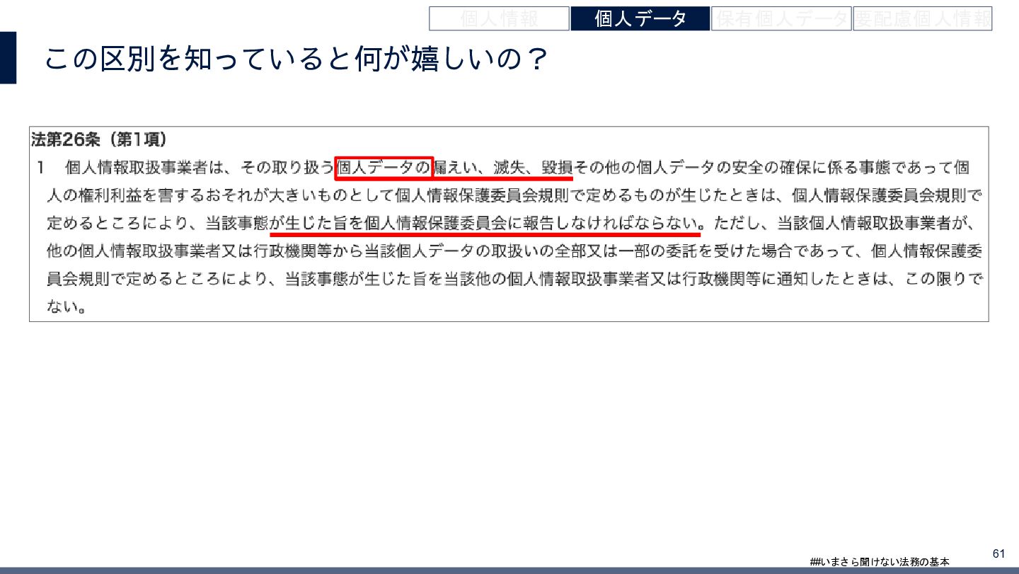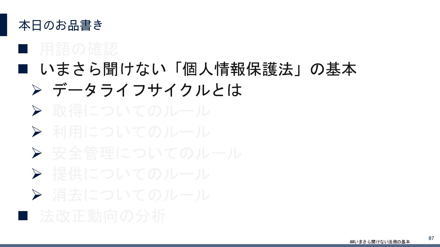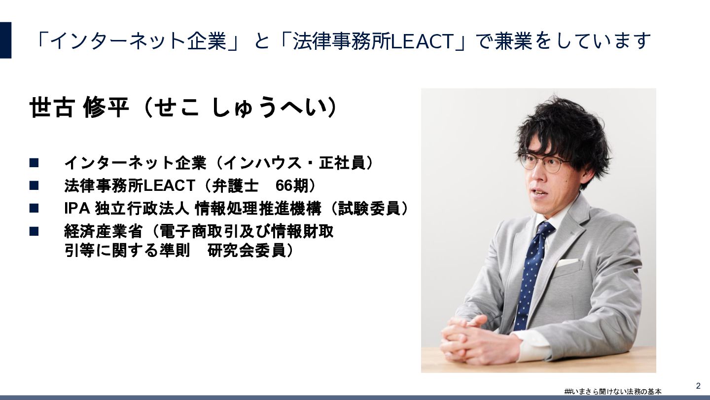 4/3(金)の12:00-13:30においてBUSINESS LAWYERS / 弁護士ドットコム株式会社様で実施した、 「いまさら聞けない法務の基本「個人情報保護法」」の登壇資料です。 https://www.businesslawyers.jp/seminars/553