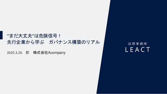 3/26(水)の18:00-19:00において株式会社Acompany様で実施した、 「“まだ大丈夫”は危険信号!先行企業から学ぶプライバシーガバナンス構築のリアル」の登壇資料です。 https://acompany.tech/event/building-privacy-governance-on-leading-companies