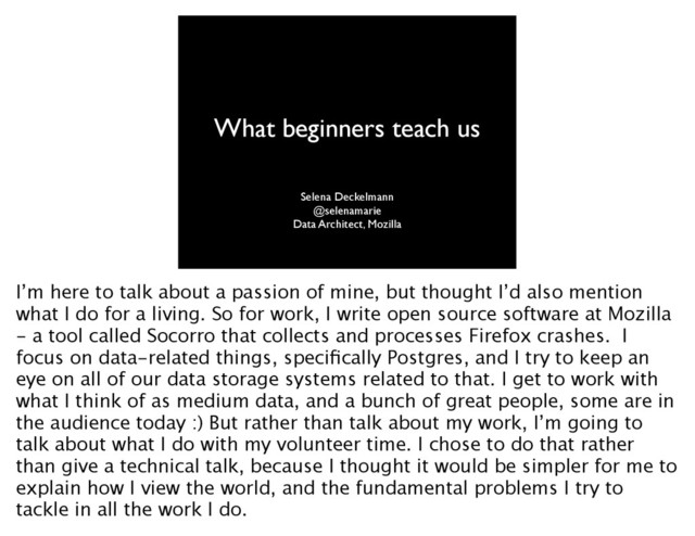 I’m here to talk about a passion of mine, but thought I’d also mention what I do for a living. So for work, I write open source software at Mozilla - a tool called Socorro that collects and processes Firefox crashes. I focus on data-related things, specifically Postgres, and I try to keep an eye on all of our data storage systems related to that. I get to work with what I think of as medium data, and a bunch of great people, some are in the audience today :) But rather than talk about my work, I’m going to talk about what I do with my volunteer time. I chose to do that rather than give a technical talk, because I thought it would be simpler for me to explain how I view the world, and the fundamental problems I try to tackle in all the work I do.