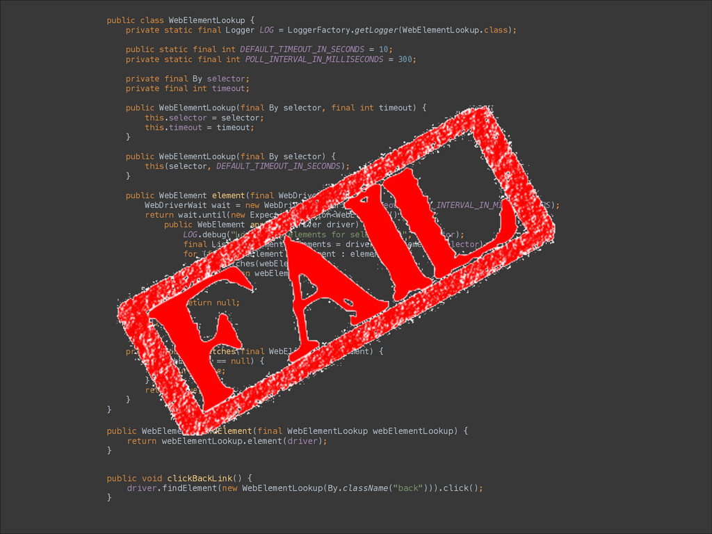 LoggerFactory.getLogger(WebElementLookup.class); public static final int DEFAULT_TIMEOUT_IN_SECONDS = 10; private static final int POLL_INTERVAL_IN_MILLISECONDS = 300; private final By selector; private final int timeout; public WebElementLookup(final By selector, final int timeout) { this.selector = selector; this.timeout = timeout; } public WebElementLookup(final By selector) { this(selector, DEFAULT_TIMEOUT_IN_SECONDS); } public WebElement element(final WebDriver driver) { WebDriverWait wait = new WebDriverWait(driver, timeout, POLL_INTERVAL_IN_MILLISECONDS); return wait.until(new ExpectedCondition<WebElement>() { public WebElement apply(WebDriver driver) { LOG.debug("Looking up elements for selector {}", selector); final List<WebElement> elements = driver.findElements(selector); for (final WebElement webElement : elements) { if (matches(webElement)) { return webElement; } } return null; } }); } private boolean matches(final WebElement webElement) { if (webElement == null) { return false; } return true; } } public WebElement findElement(final WebElementLookup webElementLookup) { return webElementLookup.element(driver); } public void clickBackLink() { driver.findElement(new WebElementLookup(By.className("back"))).click(); }