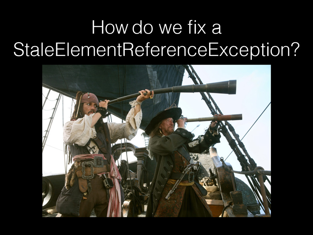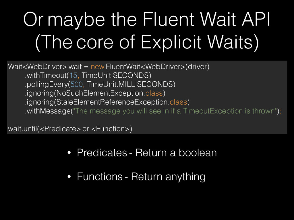 Waits) • Predicates - Return a boolean • Functions - Return anything Wait<WebDriver> wait = new FluentWait<WebDriver>(driver) .withTimeout(15, TimeUnit.SECONDS) .pollingEvery(500, TimeUnit.MILLISECONDS) .ignoring(NoSuchElementException.class) .ignoring(StaleElementReferenceException.class) .withMessage("The message you will see in if a TimeoutException is thrown"); wait.until(<Predicate> or <Function>)