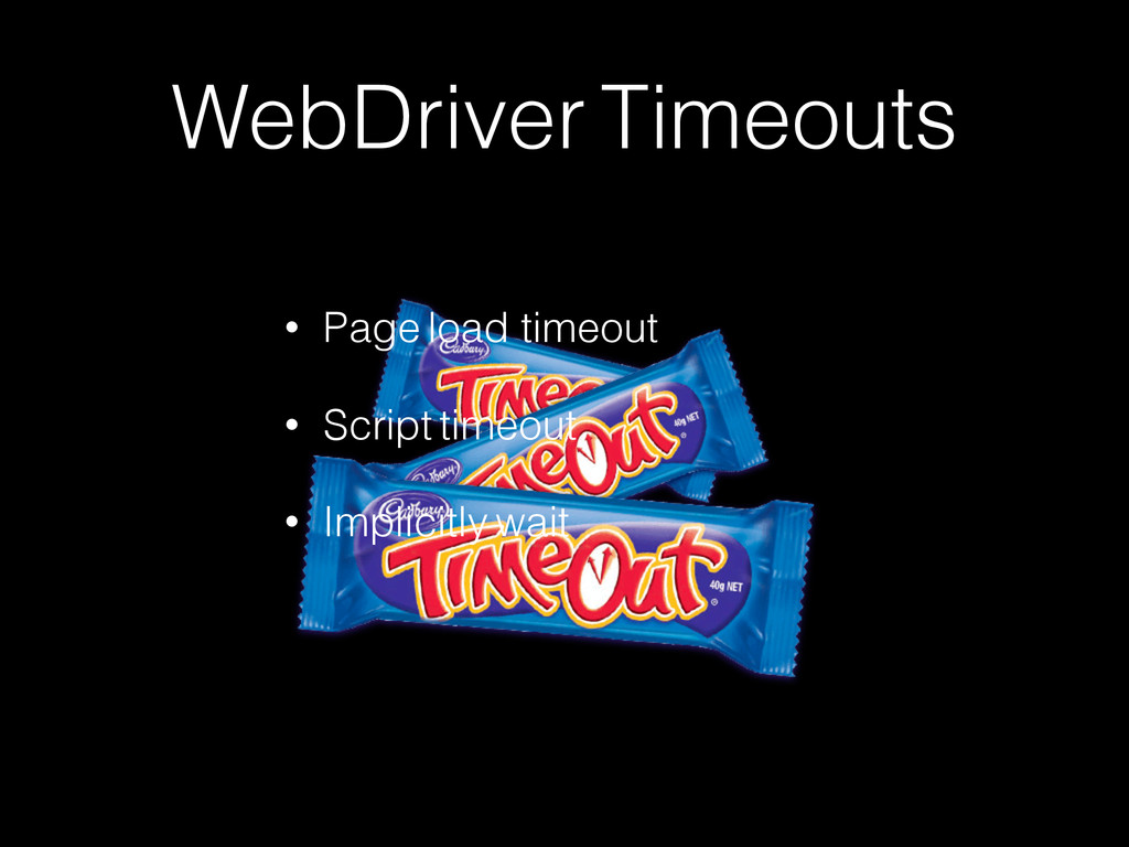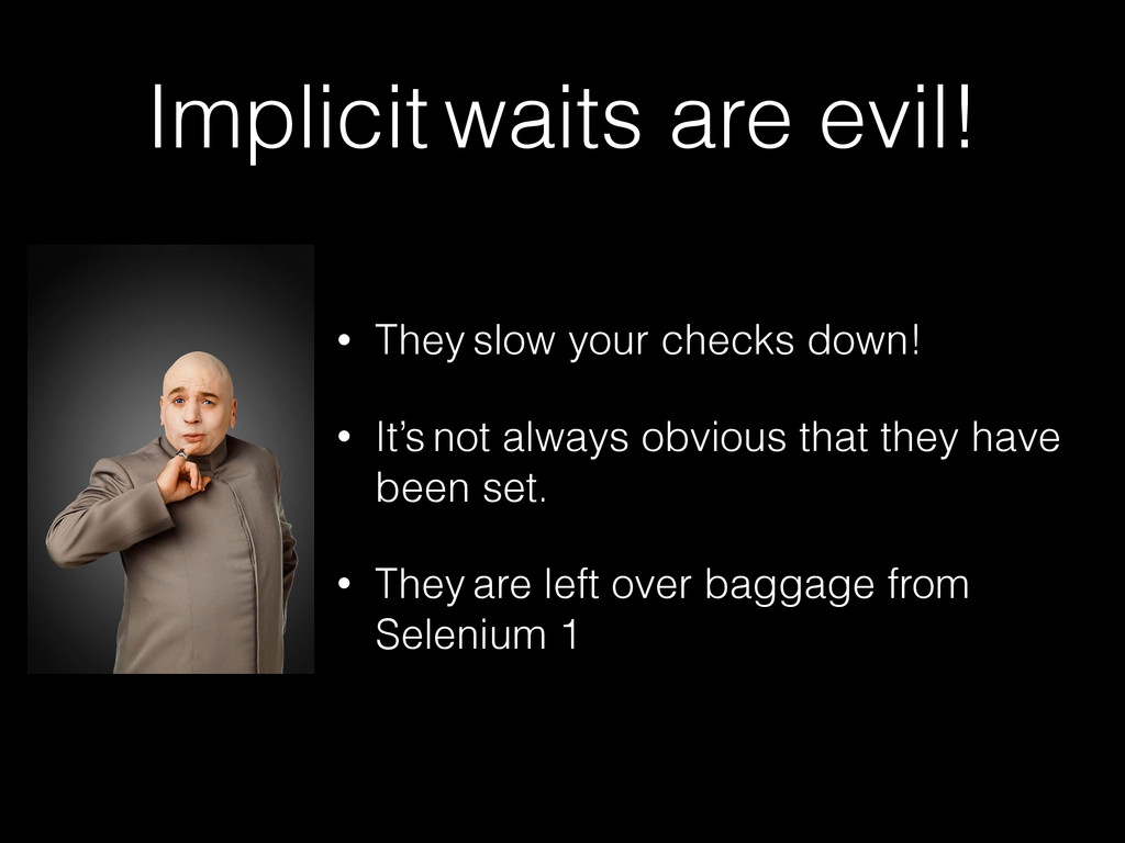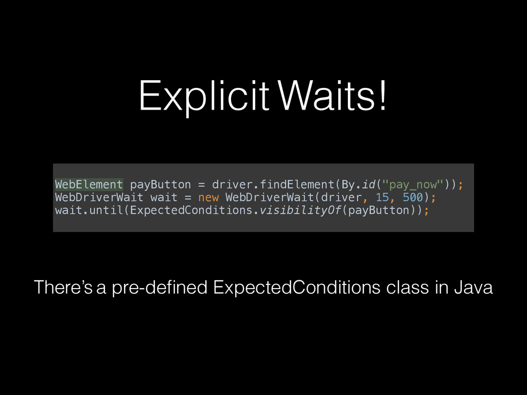 for the life of the driver object. • Try to make it clear that you are setting implicit waits in your code. But I want to use them OK you can use them, but be careful!