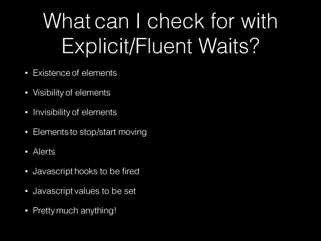 of elements • Visibility of elements • Invisibility of elements • Elements to stop/start moving • Alerts • Javascript hooks to be fired • Javascript values to be set • Pretty much anything!