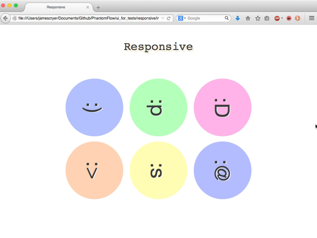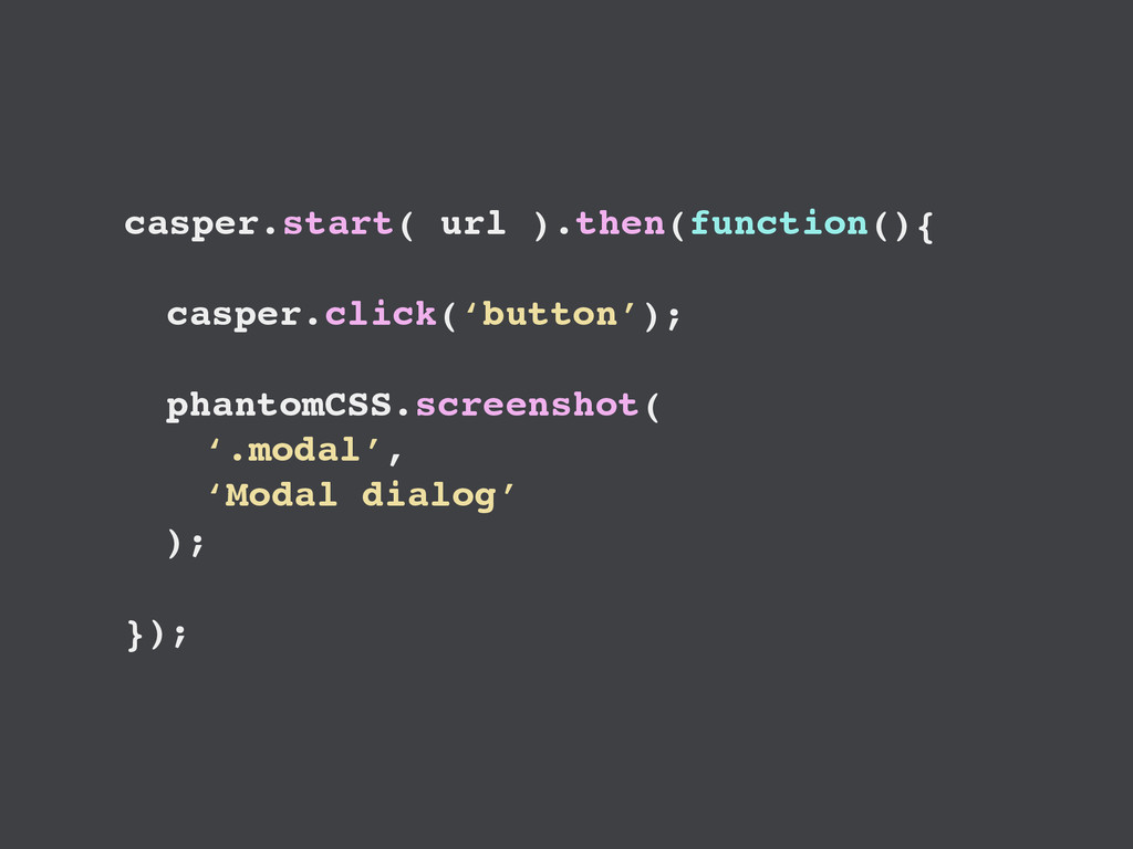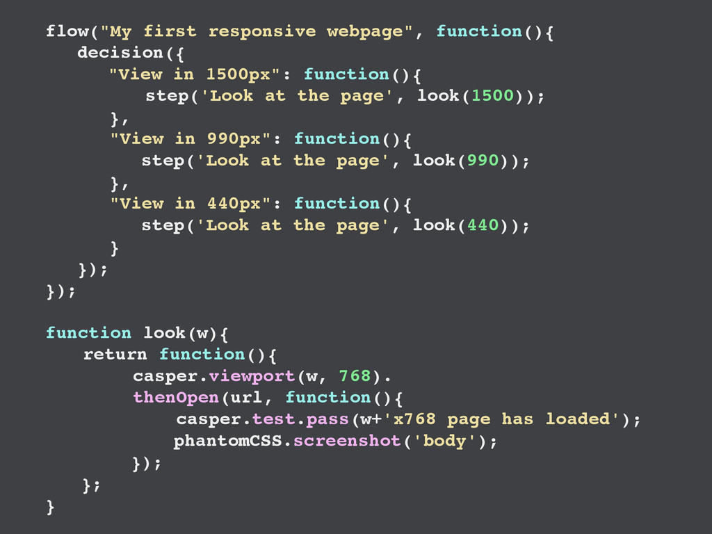 step('Look at the page', look(1500)); }, "View in 990px": function(){ step('Look at the page', look(990)); }, "View in 440px": function(){ step('Look at the page', look(440)); } }); }); function look(w){ return function(){ casper.viewport(w, 768). thenOpen(url, function(){ casper.test.pass(w+'x768 page has loaded'); phantomCSS.screenshot('body'); }); }; }