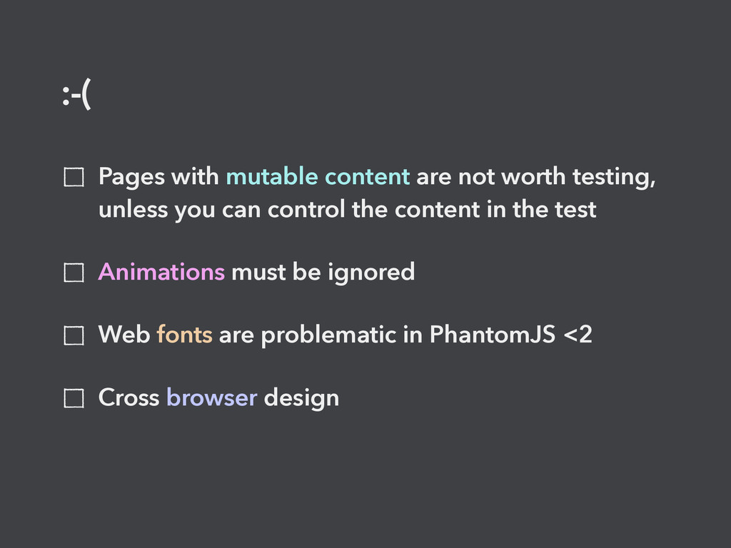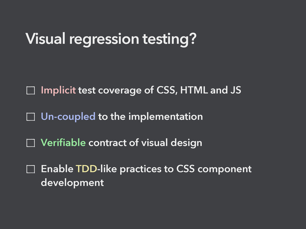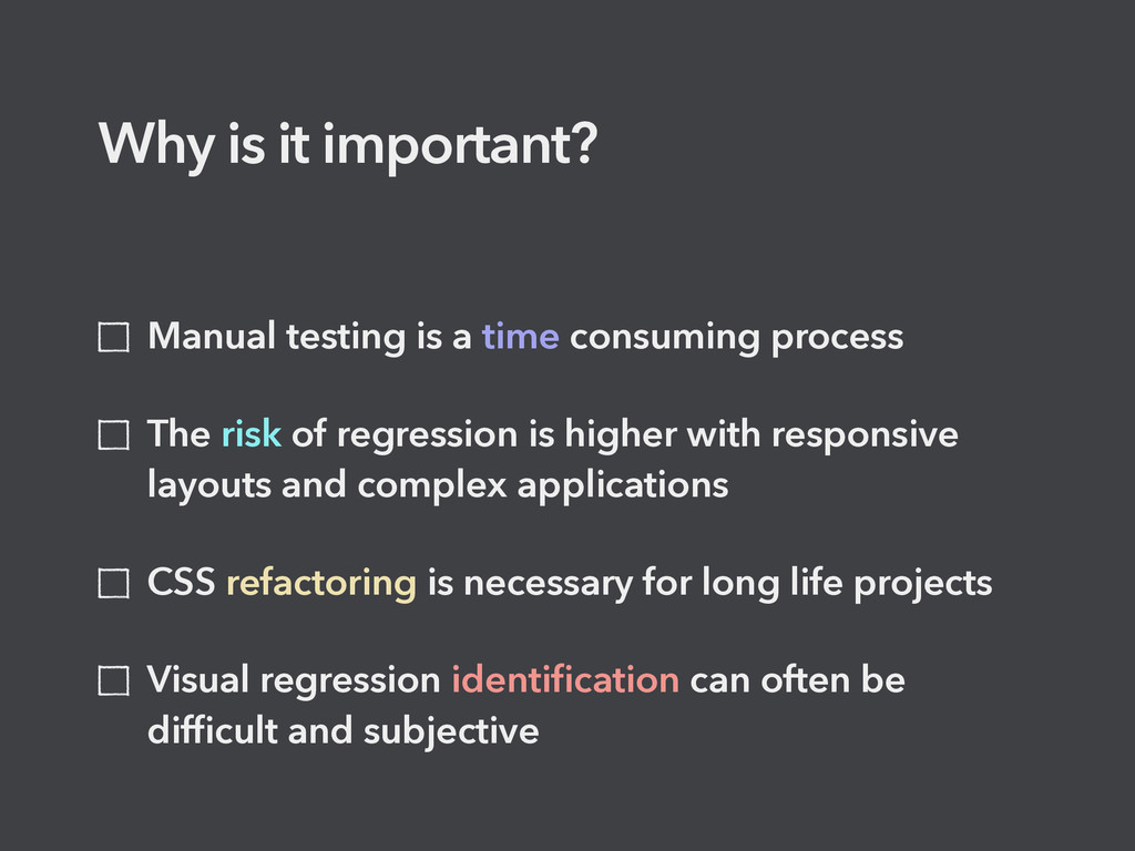 process The risk of regression is higher with responsive layouts and complex applications CSS refactoring is necessary for long life projects Visual regression identification can often be difficult and subjective