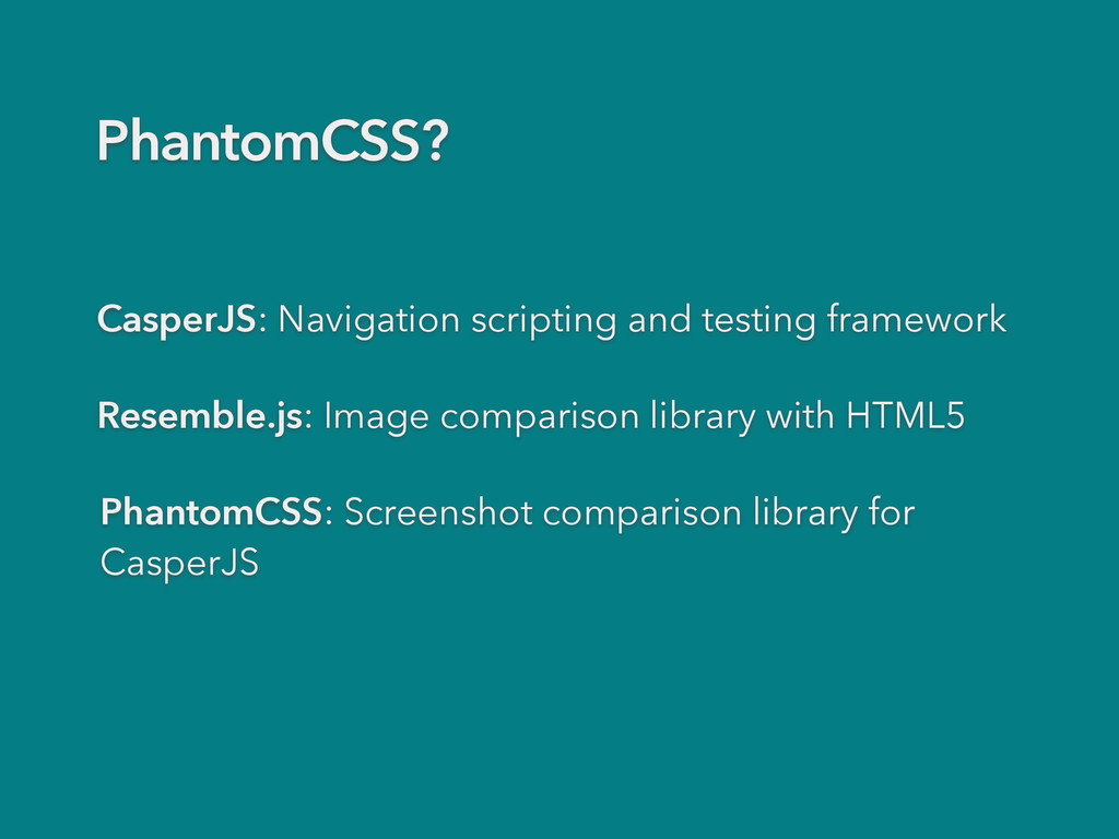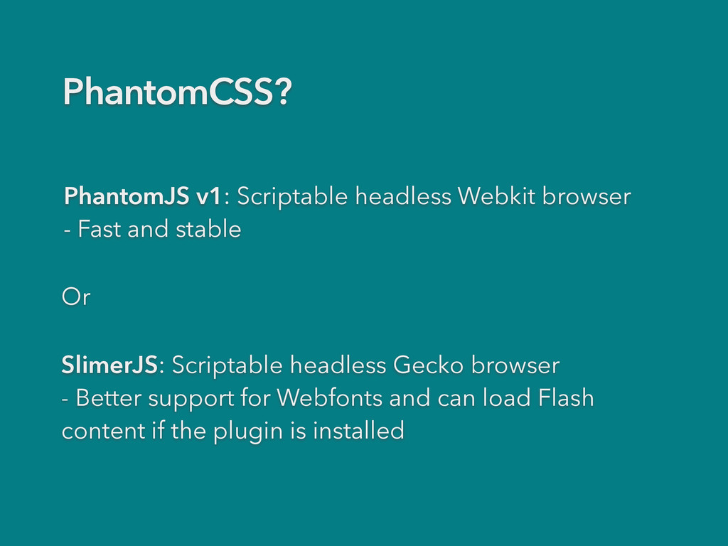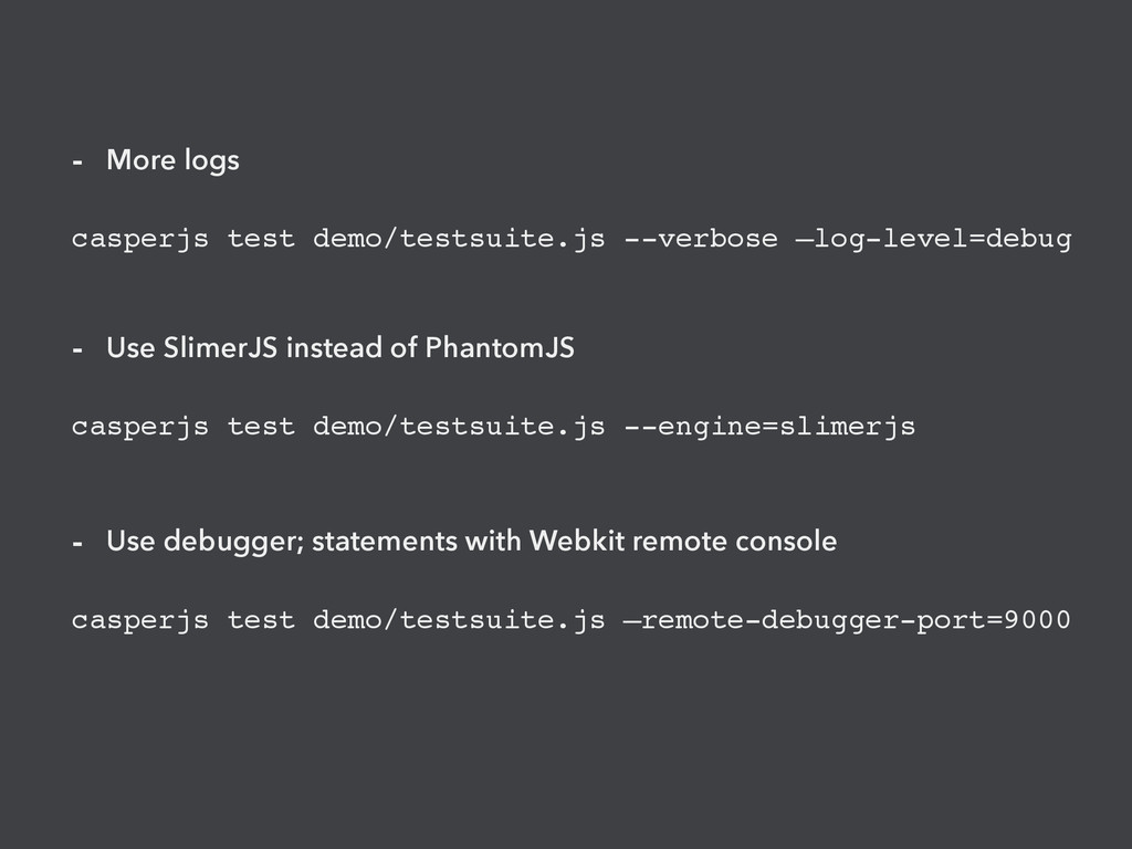 SlimerJS instead of PhantomJS casperjs test demo/testsuite.js --engine=slimerjs - Use debugger; statements with Webkit remote console casperjs test demo/testsuite.js —remote-debugger-port=9000