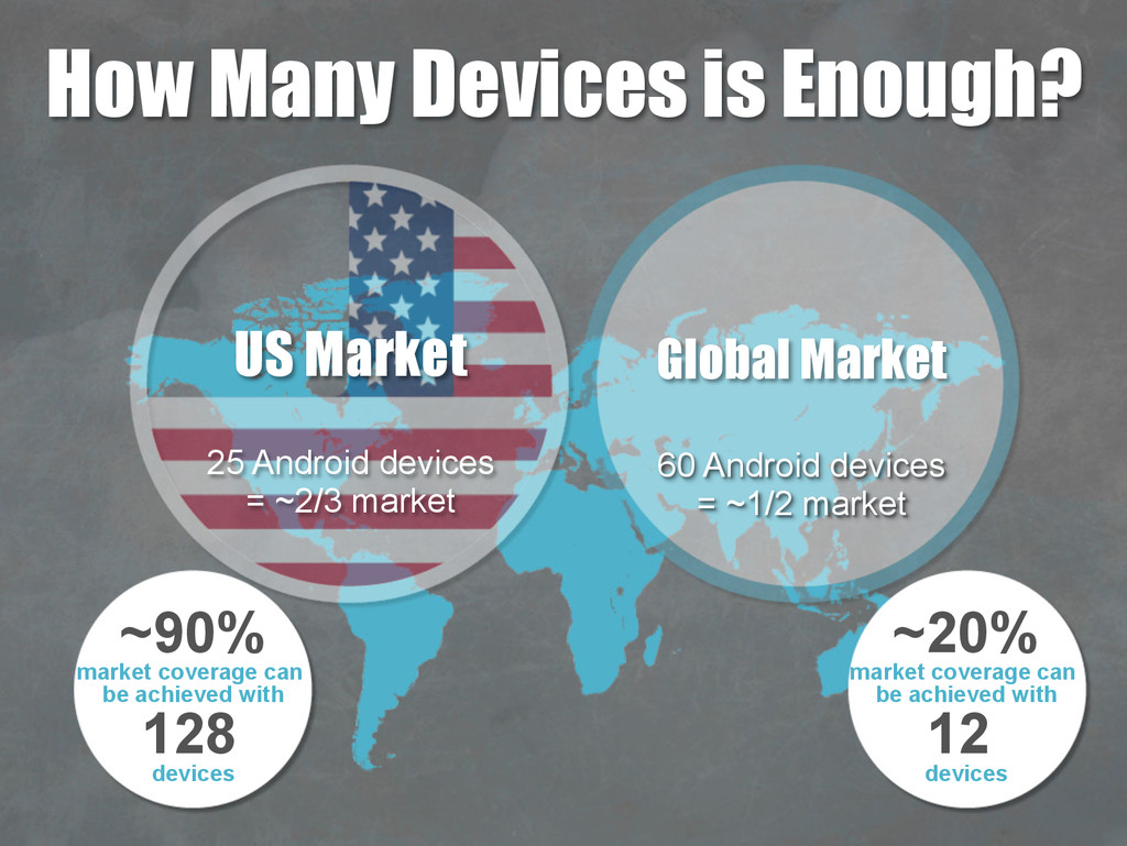 achieved with 128 devices ~20% market coverage can be achieved with 12 devices US Market 25 Android devices = ~2/3 market Global Market 60 Android devices = ~1/2 market