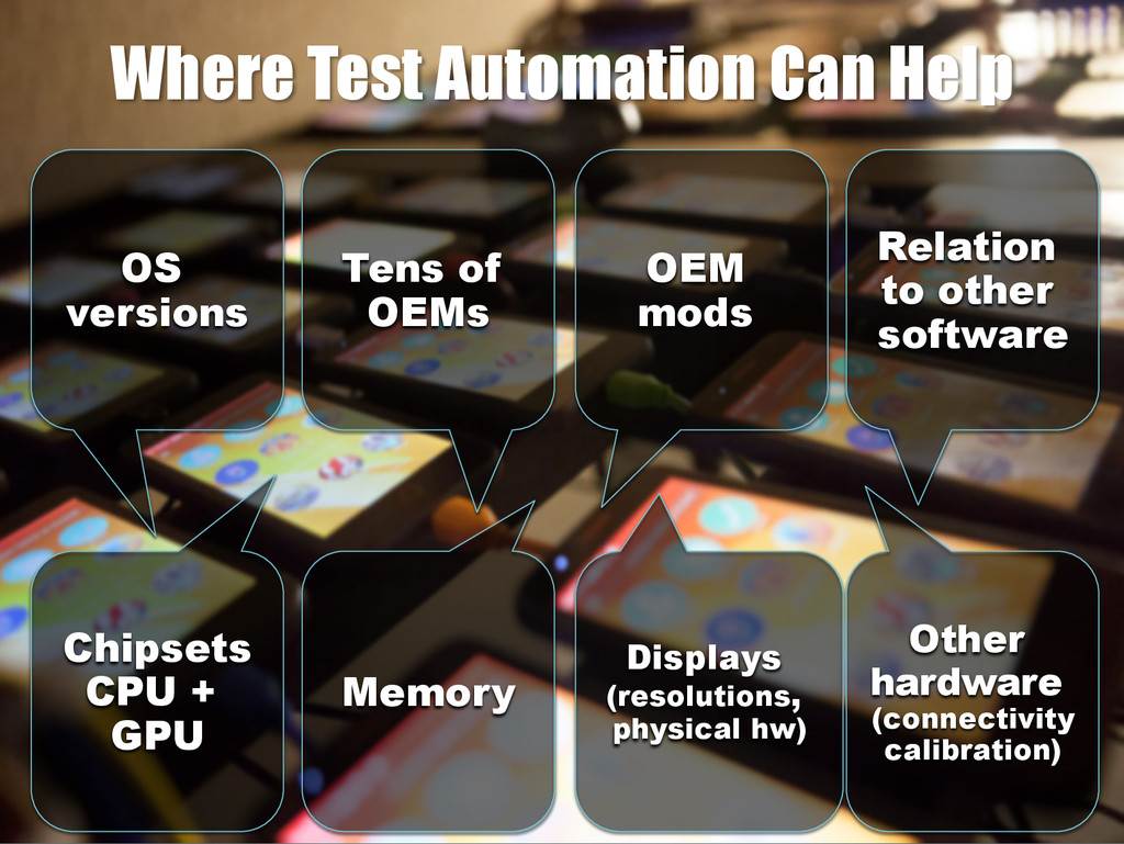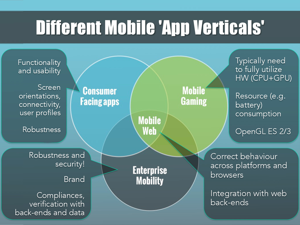 Typically need to fully utilize HW (CPU+GPU) Resource (e.g. battery) consumption OpenGL ES 2/3 Functionality and usability Screen orientations, connectivity, user profiles Robustness Robustness and security! Brand Compliances, verification with back-ends and data Different Mobile 'App Verticals'