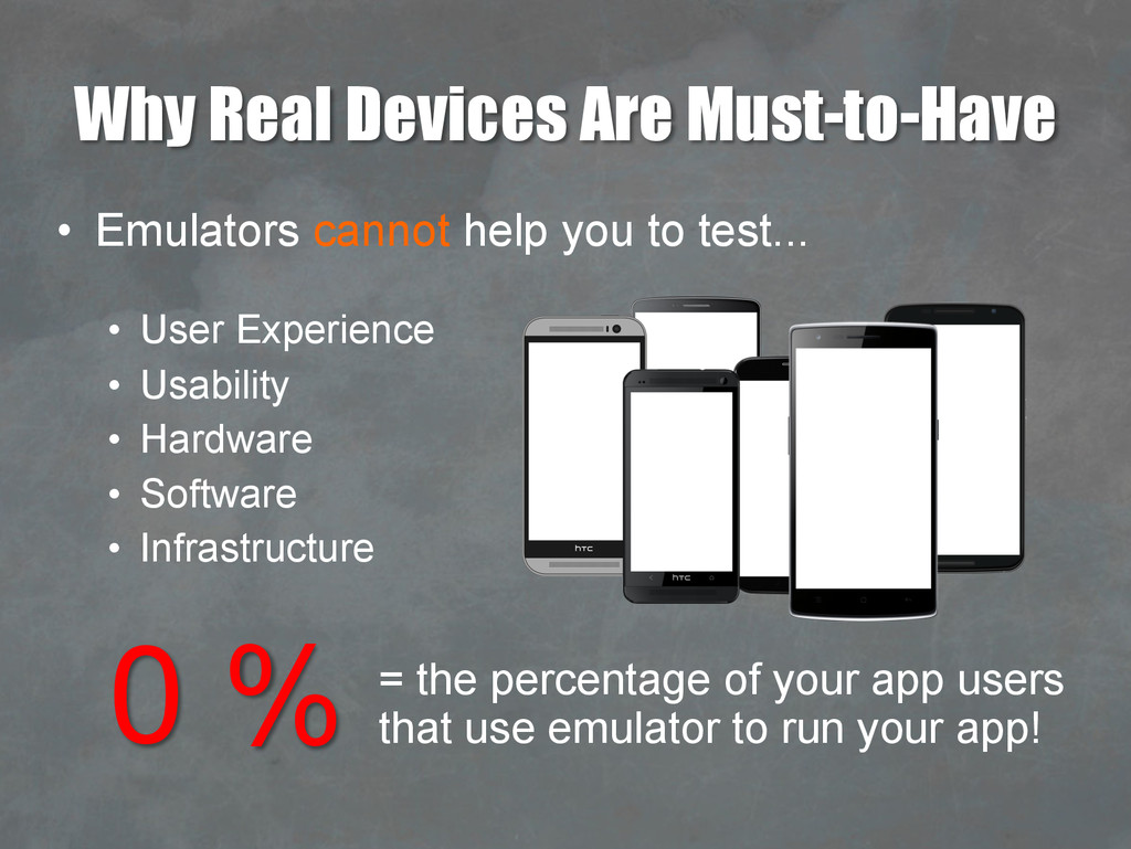 to test... • User Experience • Usability • Hardware • Software • Infrastructure 0 % = the percentage of your app users that use emulator to run your app!