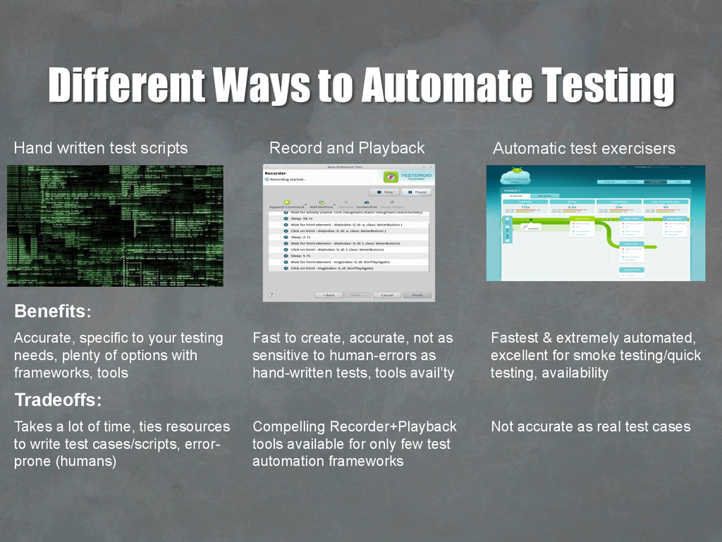 Playback Hand written test scripts Benefits: Accurate, specific to your testing needs, plenty of options with frameworks, tools Fast to create, accurate, not as sensitive to human-errors as hand-written tests, tools avail’ty Fastest & extremely automated, excellent for smoke testing/quick testing, availability Tradeoffs: Takes a lot of time, ties resources to write test cases/scripts, error- prone (humans) Compelling Recorder+Playback tools available for only few test automation frameworks Not accurate as real test cases