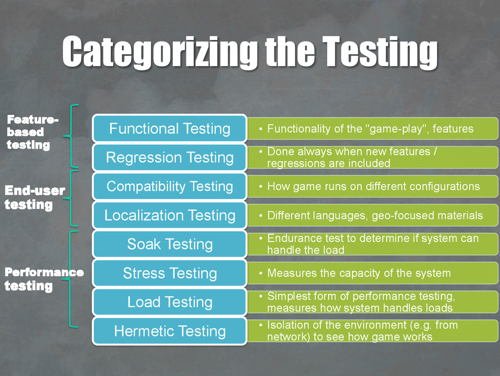 Testing • Done always when new features / regressions are included Regression Testing • How game runs on different configurations Compatibility Testing • Different languages, geo-focused materials Localization Testing • Endurance test to determine if system can handle the load Soak Testing • Measures the capacity of the system Stress Testing • Simplest form of performance testing, measures how system handles loads Load Testing • Isolation of the environment (e.g. from network) to see how game works Hermetic Testing Feature- based testing Performance testing End-user testing
