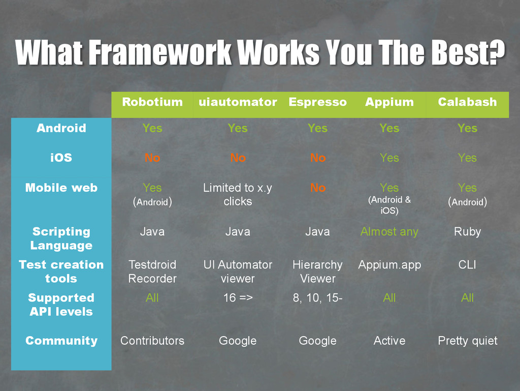 Calabash Android Yes Yes Yes Yes Yes iOS No No No Yes Yes Mobile web Yes (Android) Limited to x.y clicks No Yes (Android & iOS) Yes (Android) Scripting Language Java Java Java Almost any Ruby Test creation tools Testdroid Recorder UI Automator viewer Hierarchy Viewer Appium.app CLI Supported API levels All 16 => 8, 10, 15- All All Community Contributors Google Google Active Pretty quiet