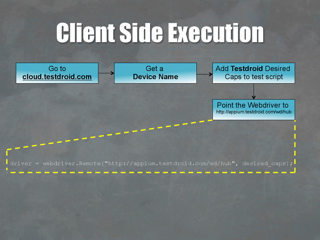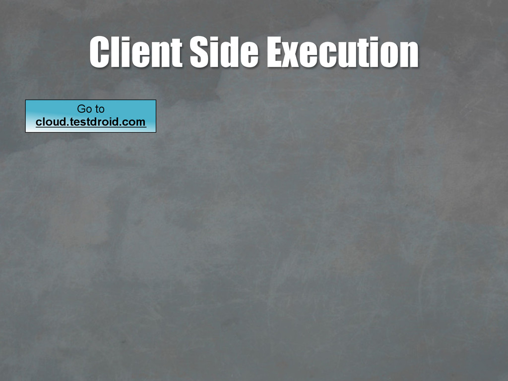driver = webdriver.Remote("http://appium.testdroid.com/wd/hub", desired_caps); Run the Test Script Get Results from Testdroid Cloud Point the Webdriver to http://appium.testdroid.com/wd/hub Add Testdroid Desired Caps to test script Get a Device Name Go to cloud.testdroid.com